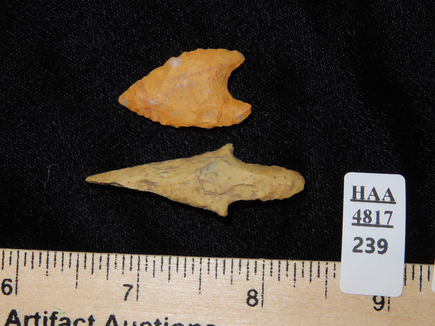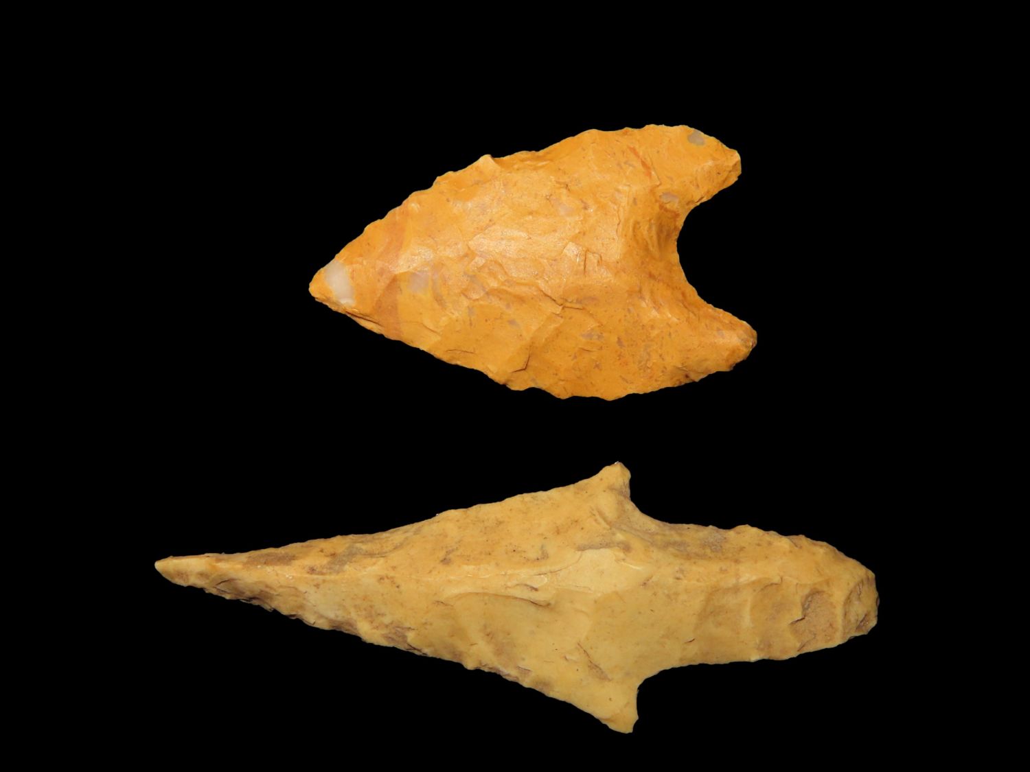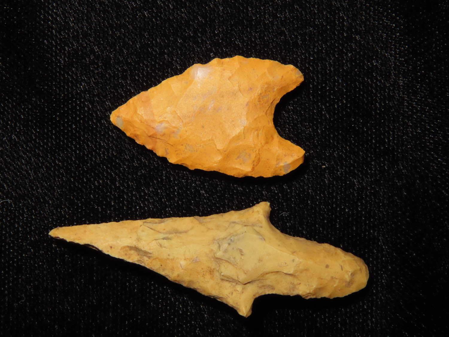 1 3/16″ McKean Point, found in Wyoming, and a 1 13/16″ Adena-type Birdpoint, found in Mississippi, purchased from Jim Bennett at Premiere Auctions in 2017, Ex Ron Comer Collection