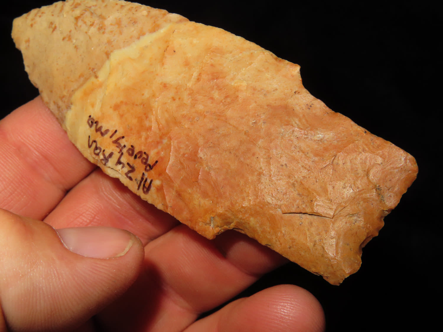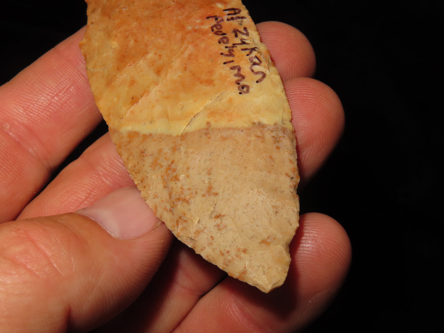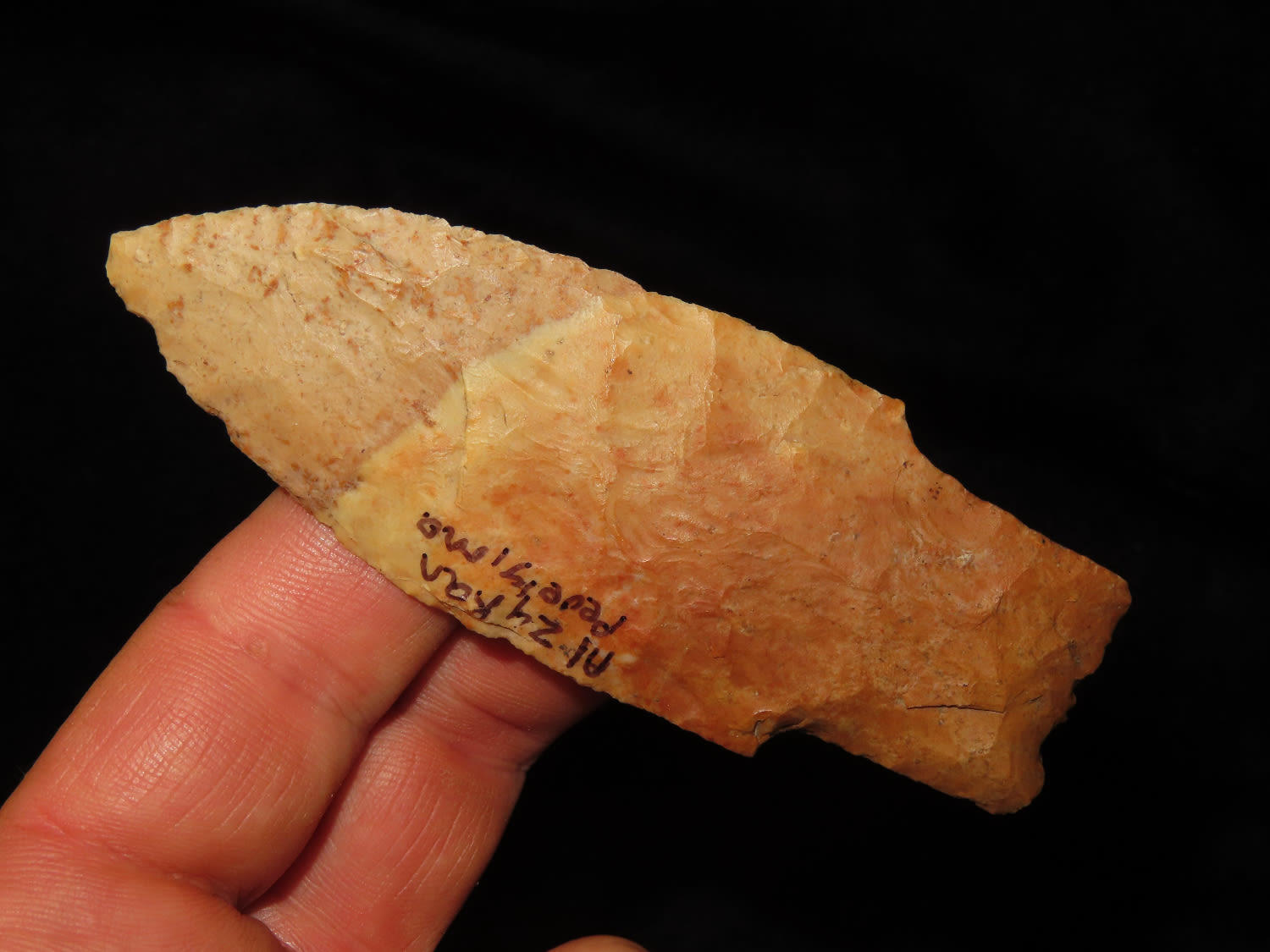3 3/4″ Crowley’s Ridge Chert Kramer, Motley COA, found by Al Zykon in Jefferson Co Missouri, Ex George Robertston Collection