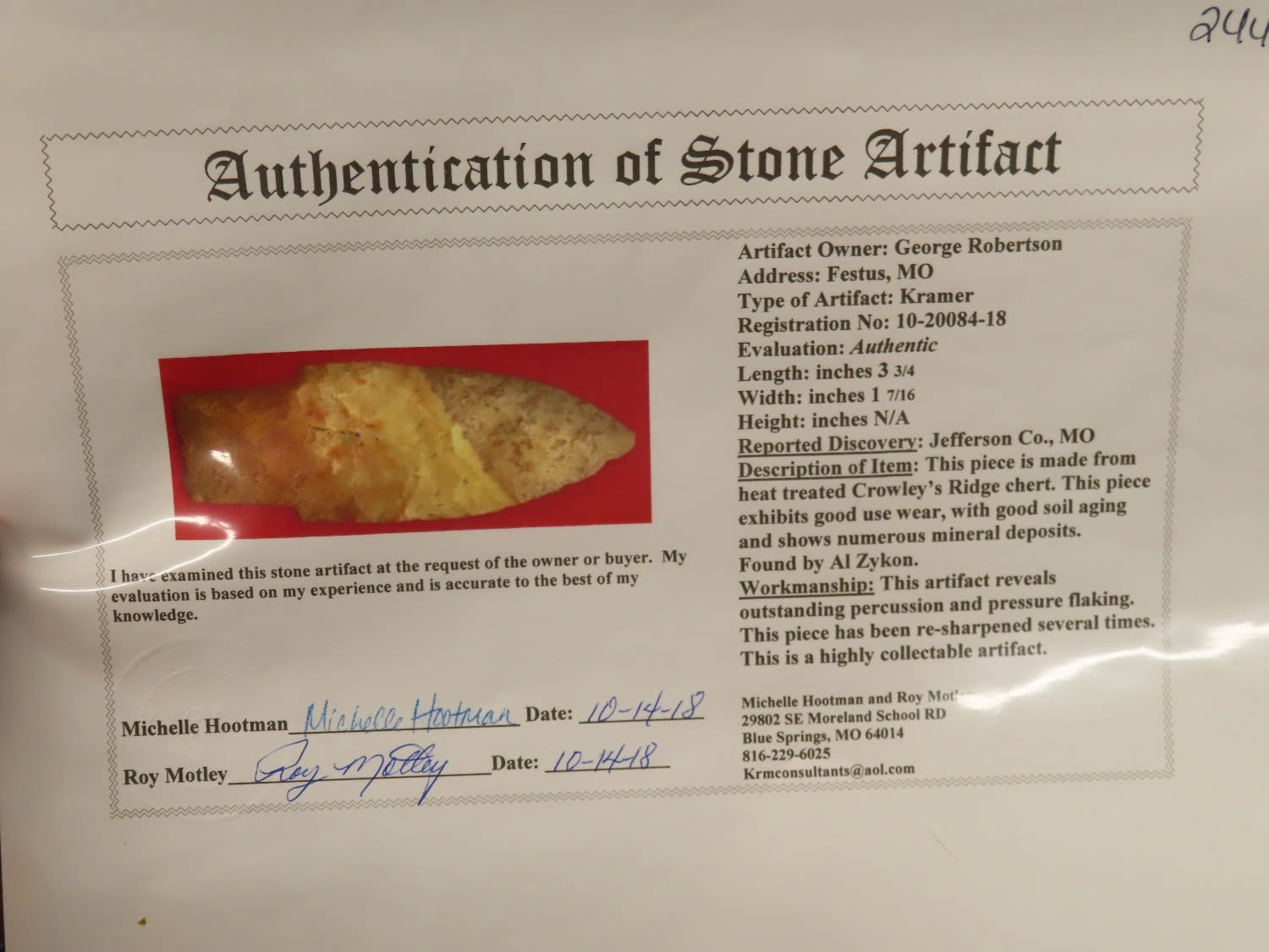 3 3/4" Crowley's Ridge Chert Kramer, Motley COA, found by Al Zykon in Jefferson Co Missouri, Ex George Robertston Collection