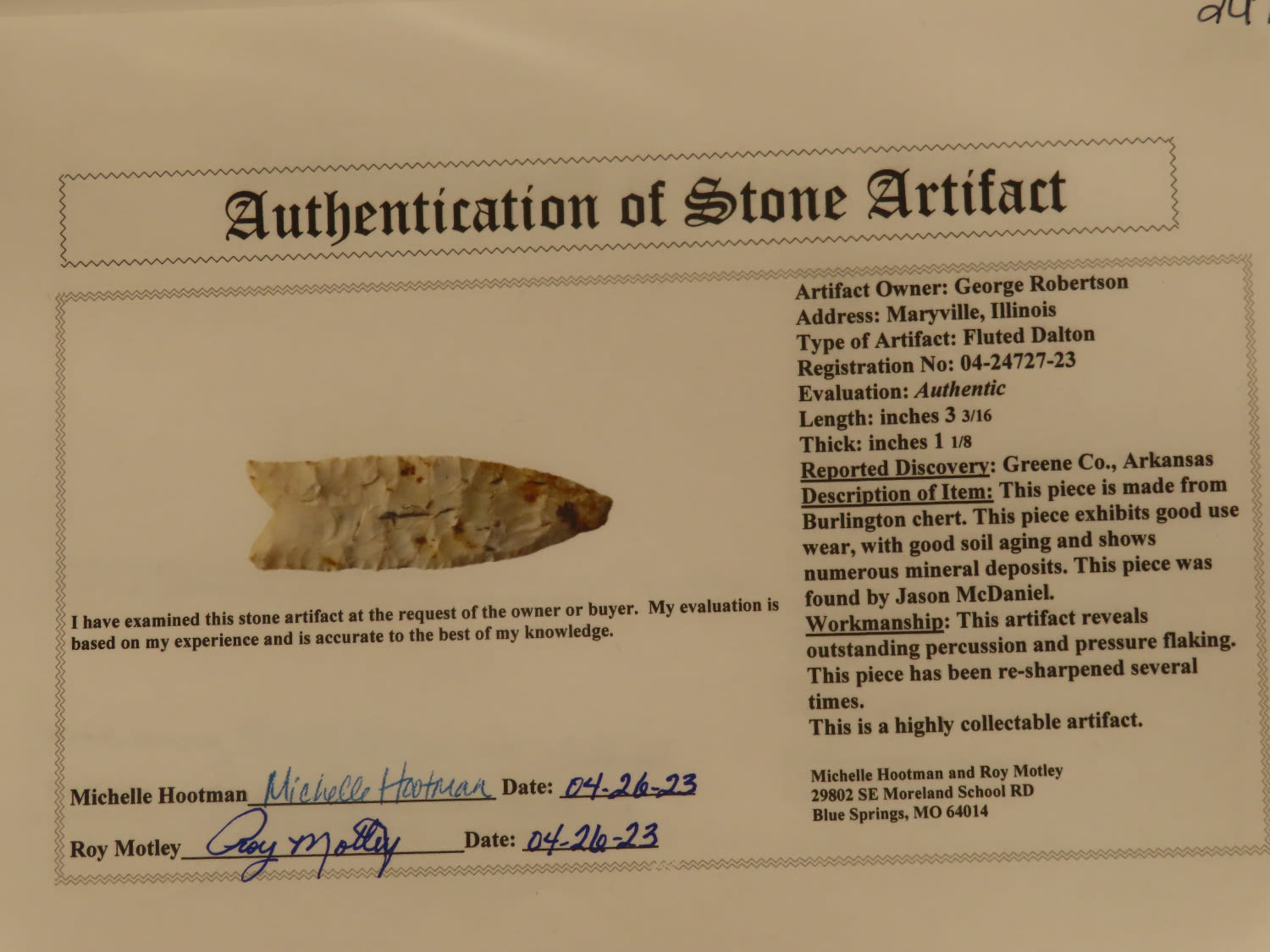 3 3/16″ Fluted Dalton, Motley COA, found by Jason McDaniel in Greene Co. Arkansas, Ex George Robertston Collection