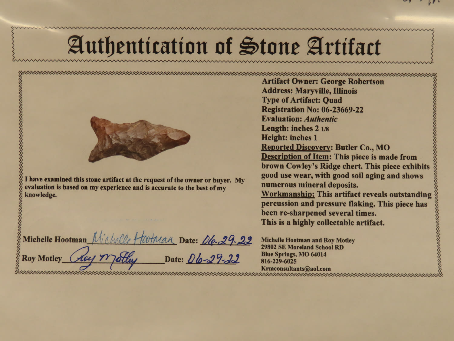 2 1/8" Quad, Motley COA, found in Butler Co. Missouri, Ex George Robertston Collection