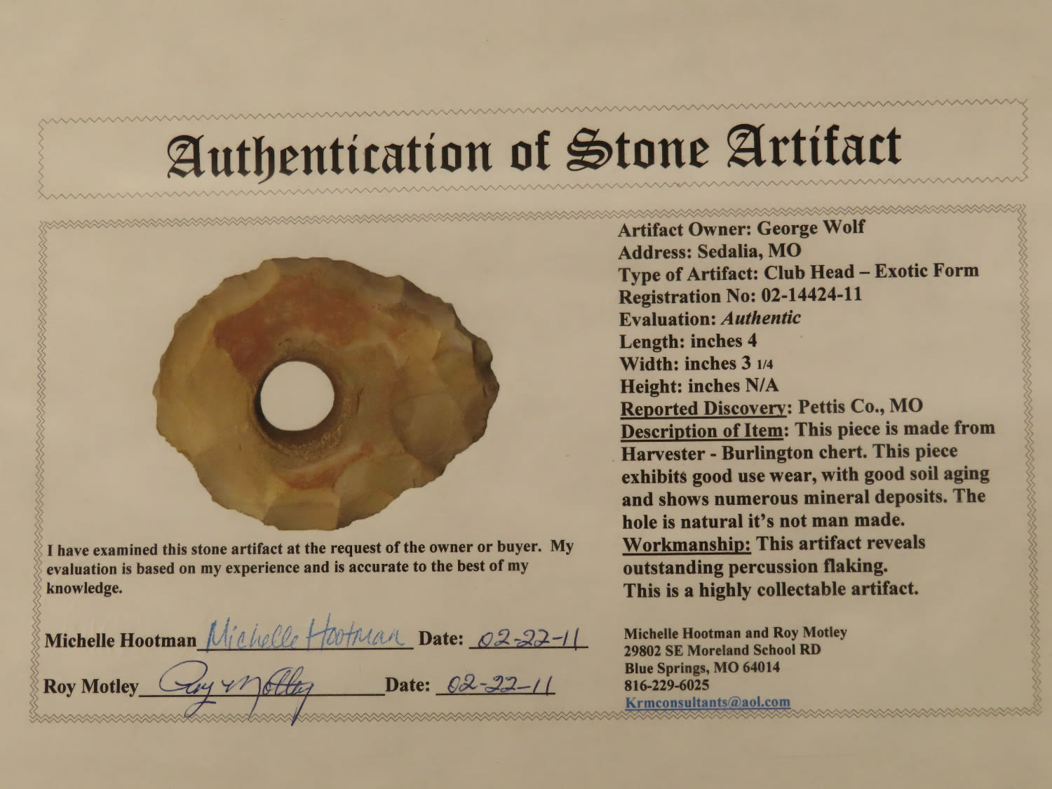 4″ Club Head-Exotic Form, Motley COA, found in Pettis Co, MO