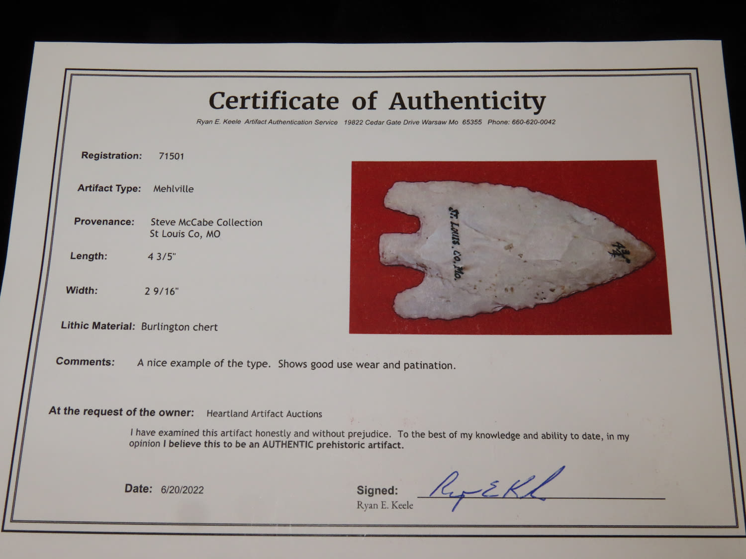 4 3/4″ Smith, Keele COA, well made point found in St Louis CO MO