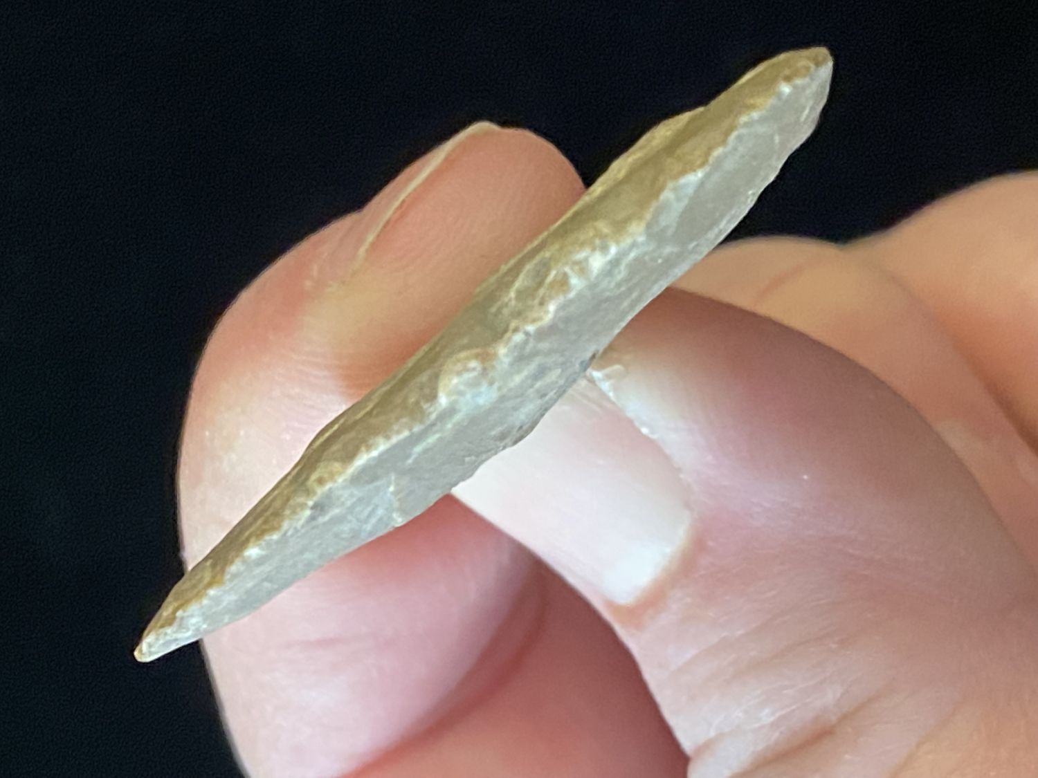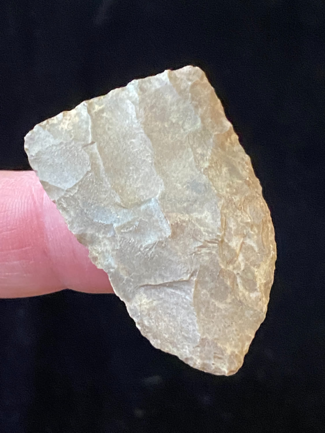 1.5/8″ Early Lance / Paleo, Very unique flaking with a lightly ground base. Found in Southern Illinois