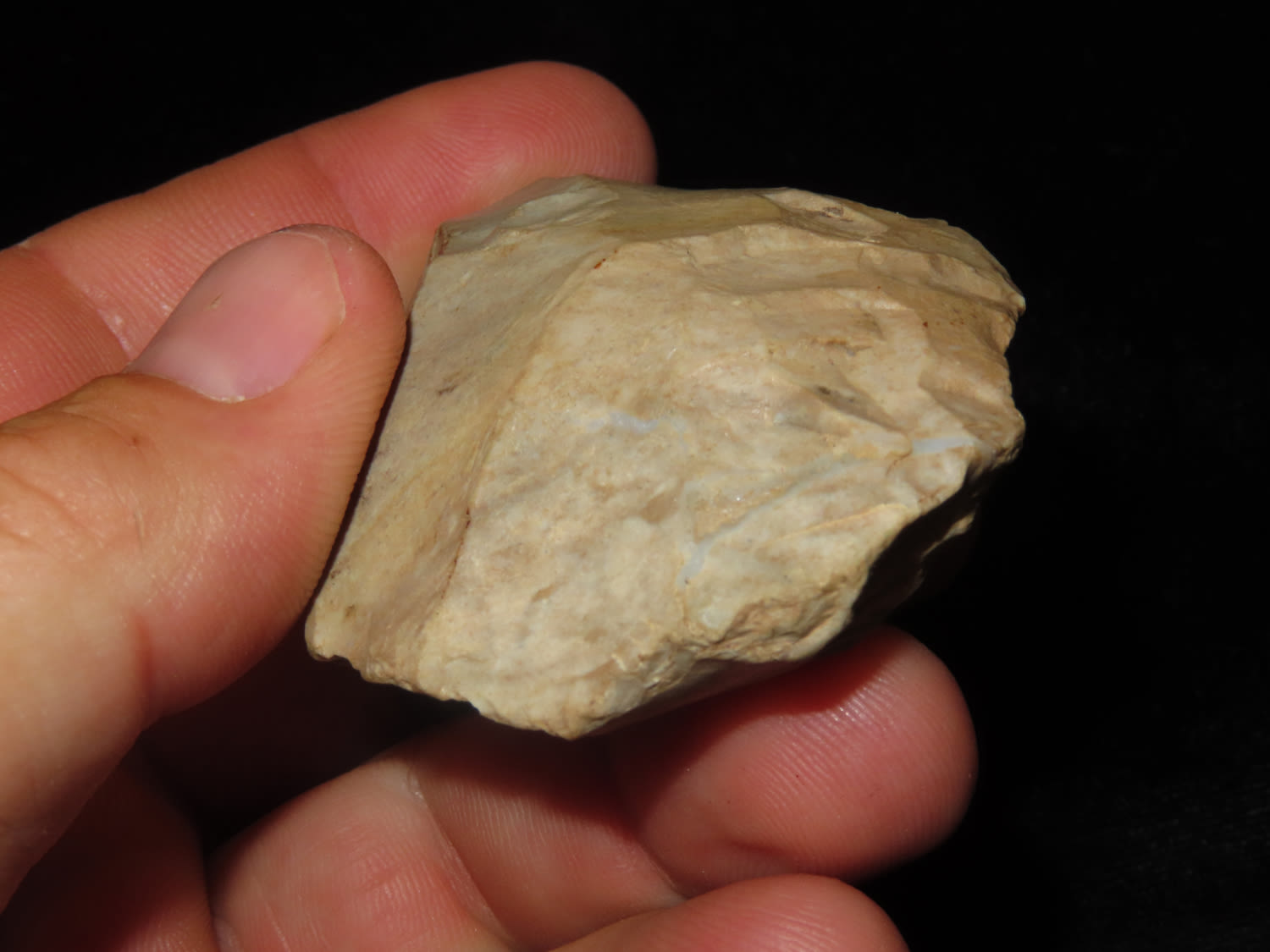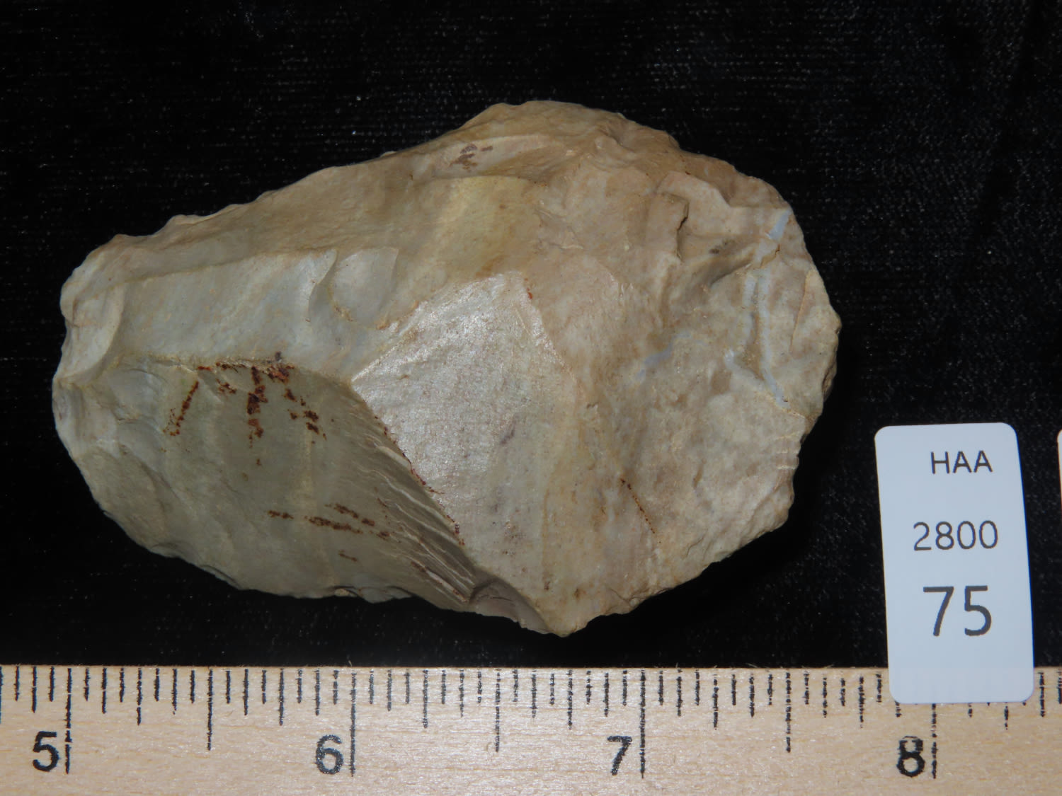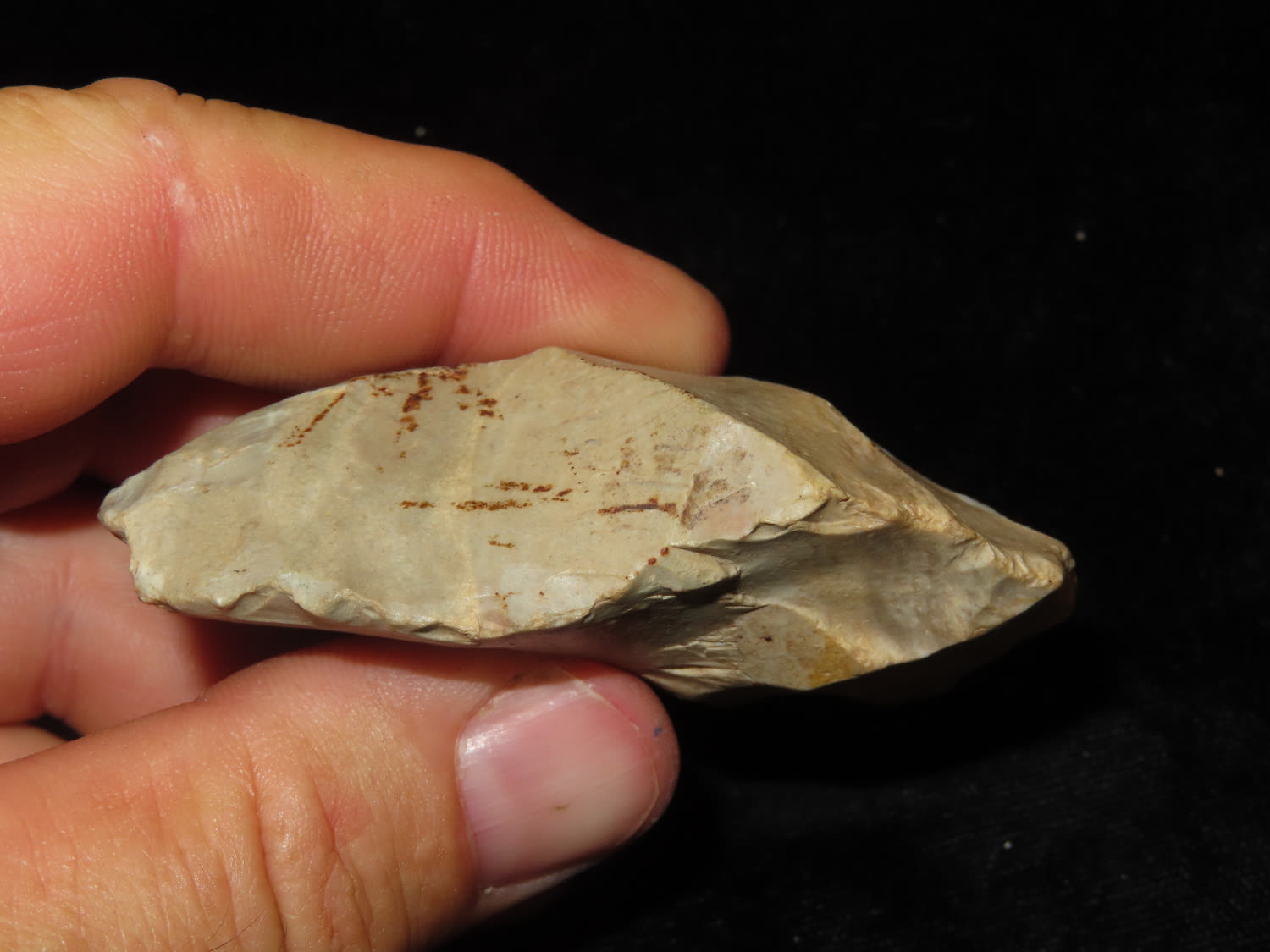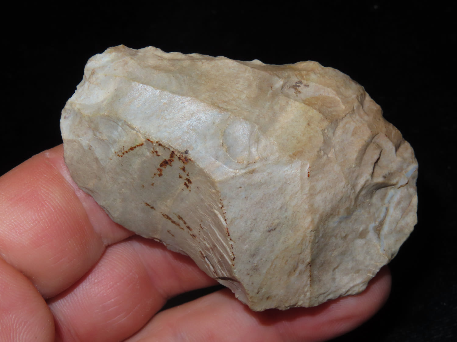 2.3/4″ Indiana Green Flint Celt with Use wear to the Bit, found by Jim and Burley Fritz in Pulaski County Indiana