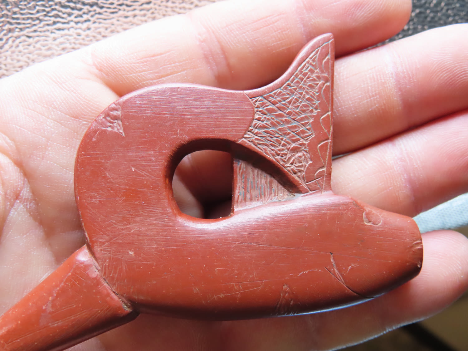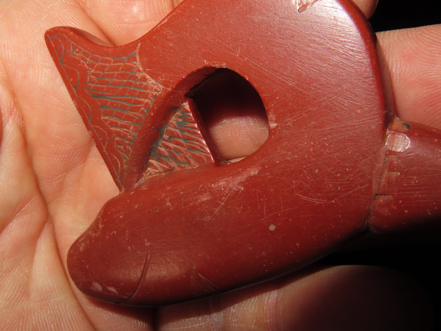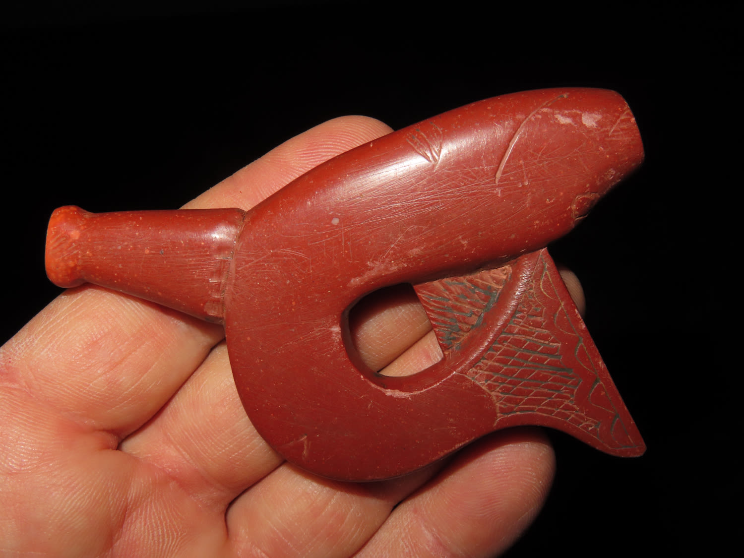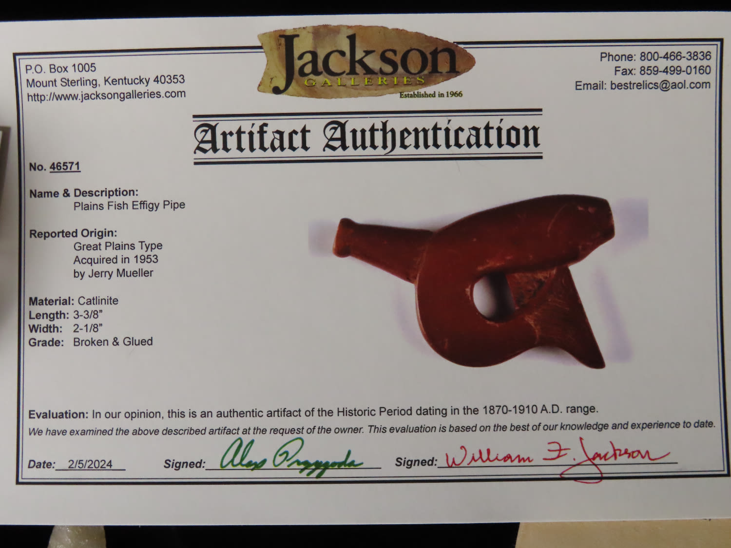 3 3/8″ Plains Fish Effigy Pipe, Jackson COA, broken and glued, Ex Jerry Mueller Collection