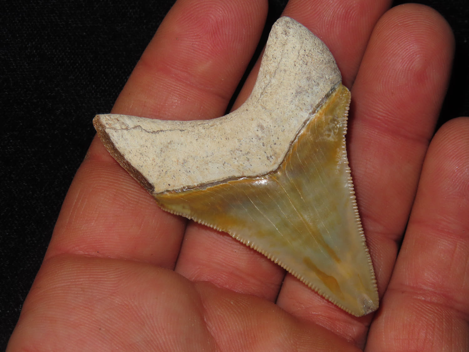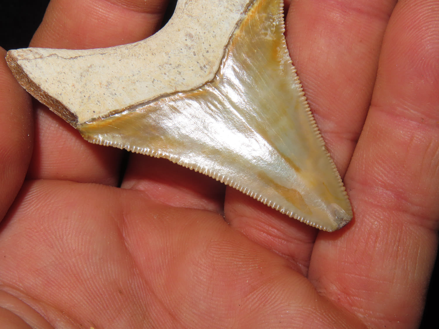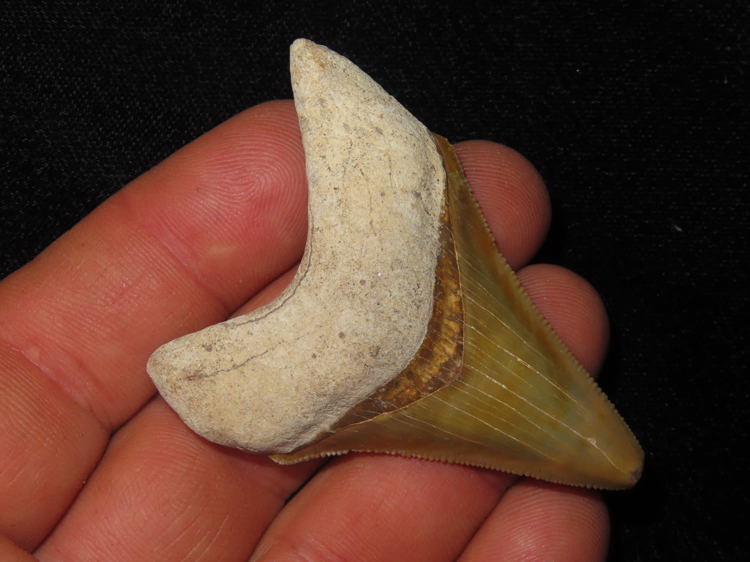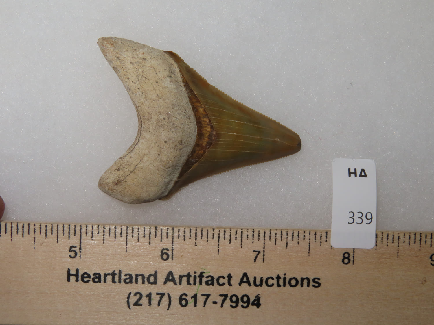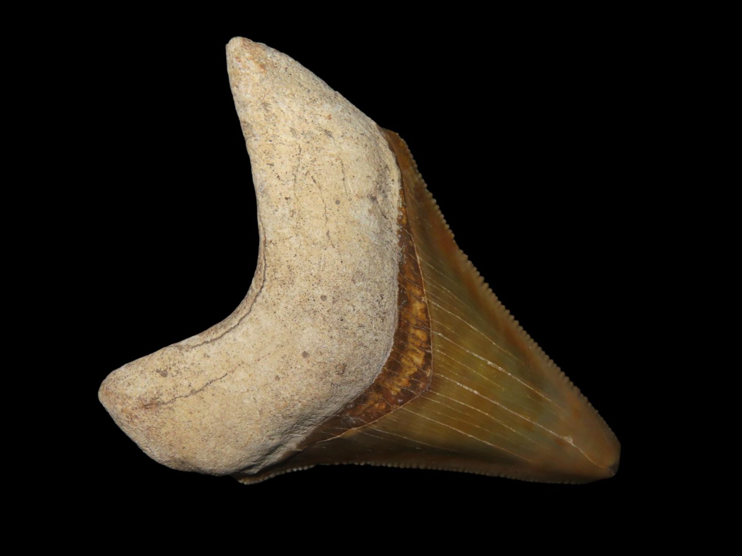 2 1/2″ Rare Fossilized Megaladon Shark Tooth, found in the Bone Valley Formation located in Florida, highly serrated, excellent condition