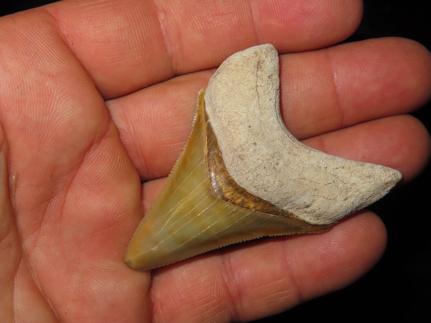 2 1/2" Rare Fossilized Megaladon Shark Tooth, found in the Bone Valley Formation located in Florida, highly serrated, excellent condition