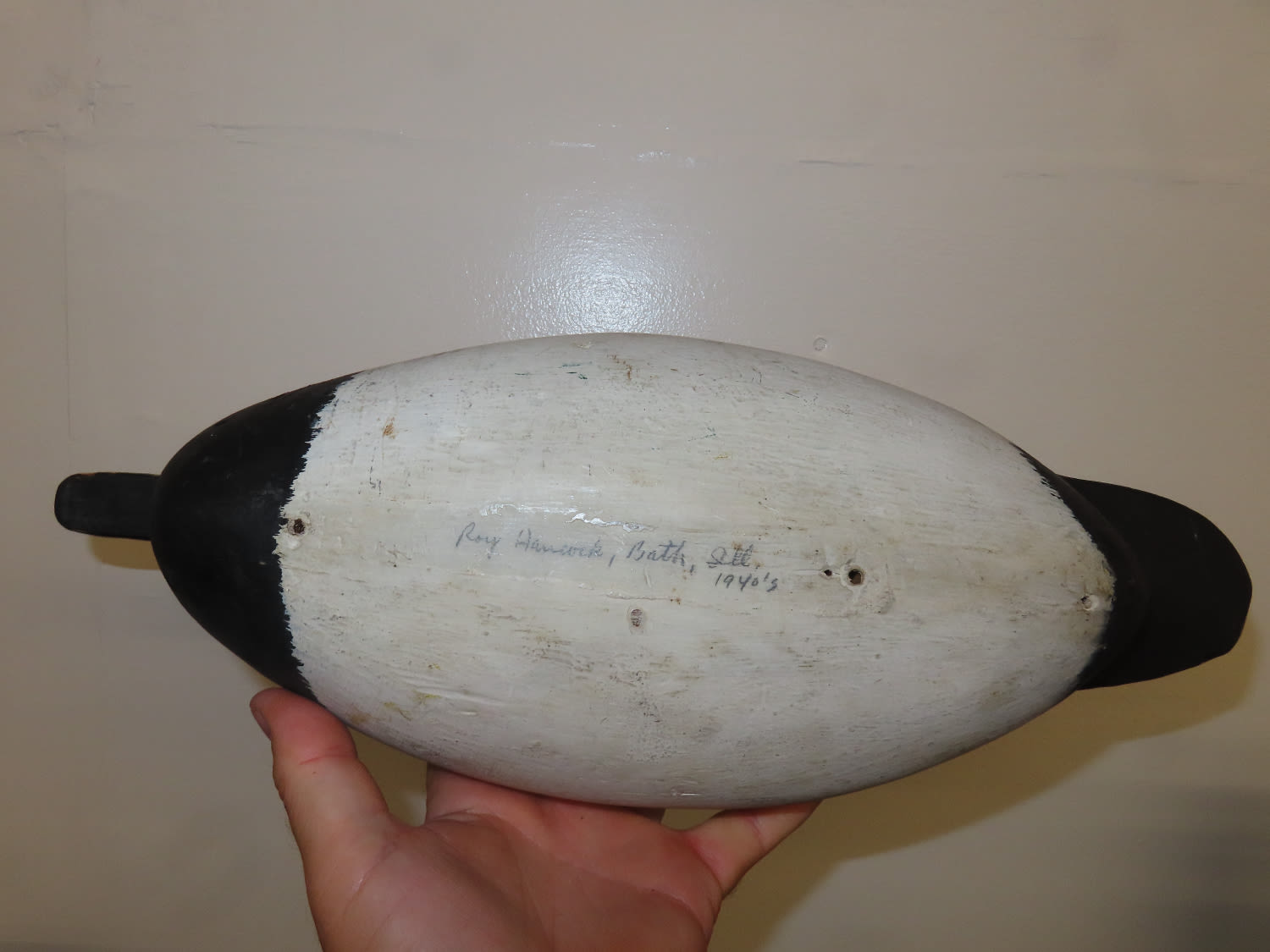 Sale Highlight! Working Canvas Back Decoy, made by Roy Hancock in the 1940’s, original eyes, has been repainted, Ex Briscoe Collection, Duck/Goose Decoy, Waterfowl, Hunting, Primitive, Antique, Quincy Illinois