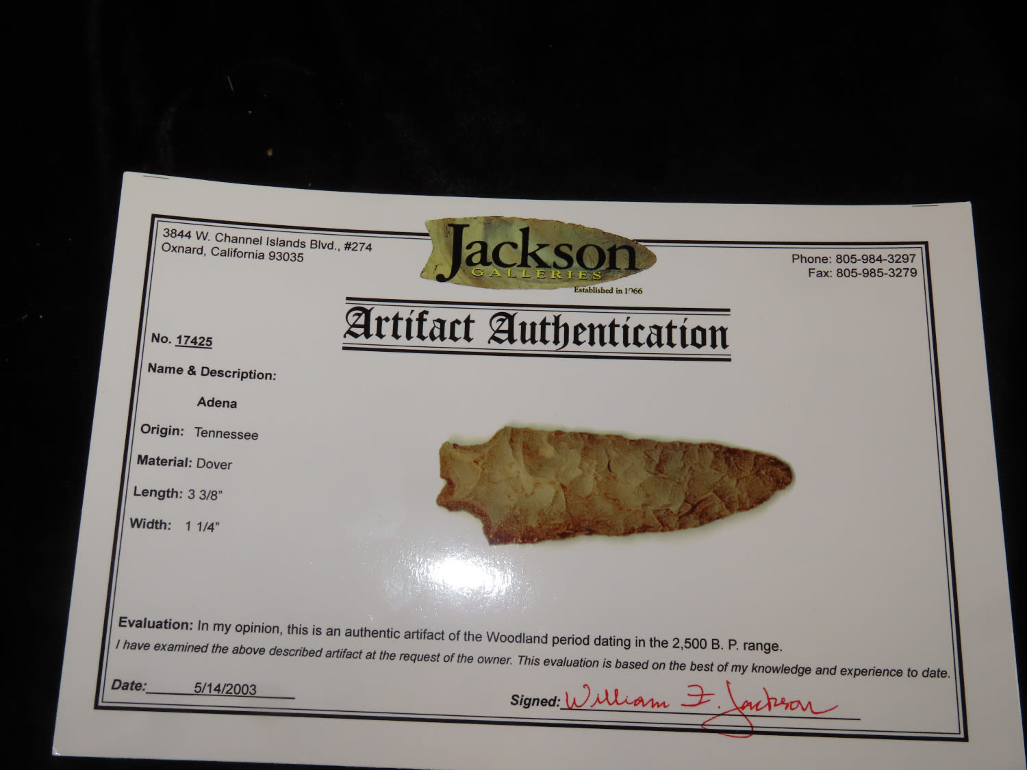 3 3/8″ Tennessee Adena, Jackson COA made of Dover Chert
