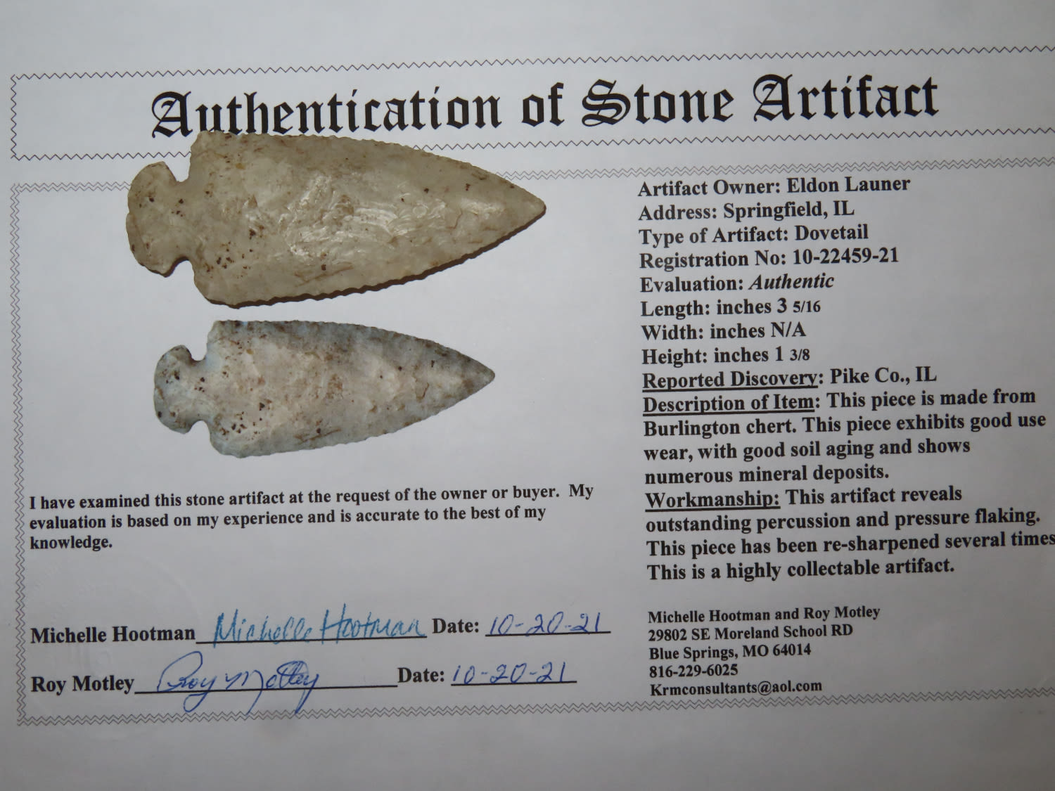 3 5/16″ Dovetail Pike CO Illinois EX: Elden Launer Motley COA