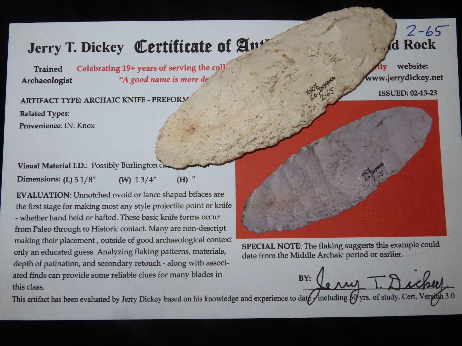 5 1/8″ Archaic Knife Knox Co Indiana Dickey COA