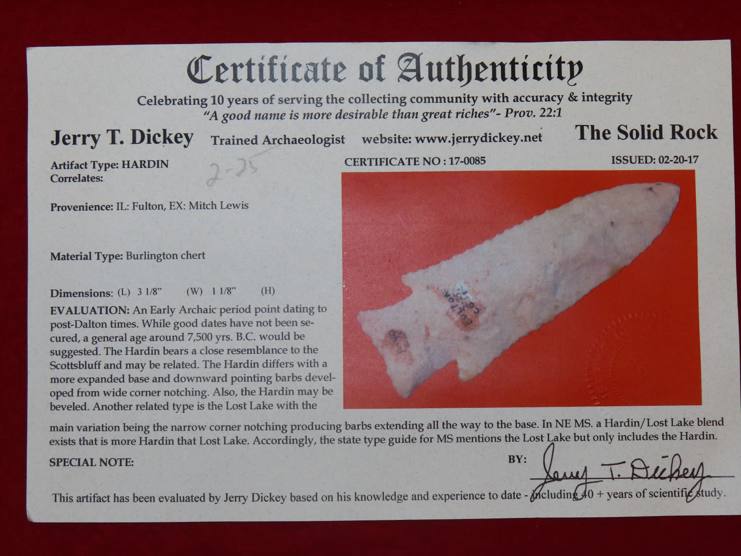 3 1/8″ Fishtail Hardin, Dickey COA, Fulton Co IL