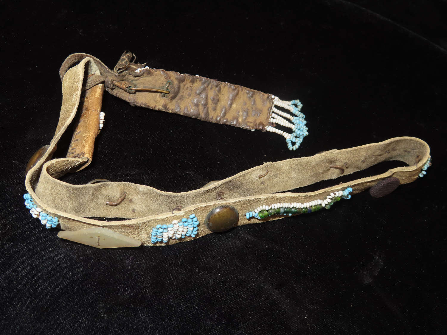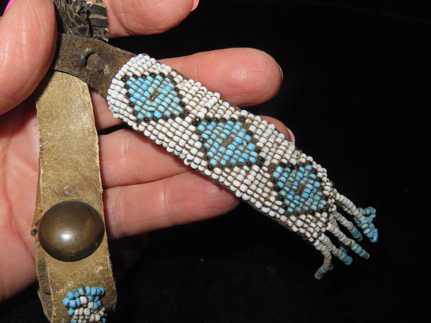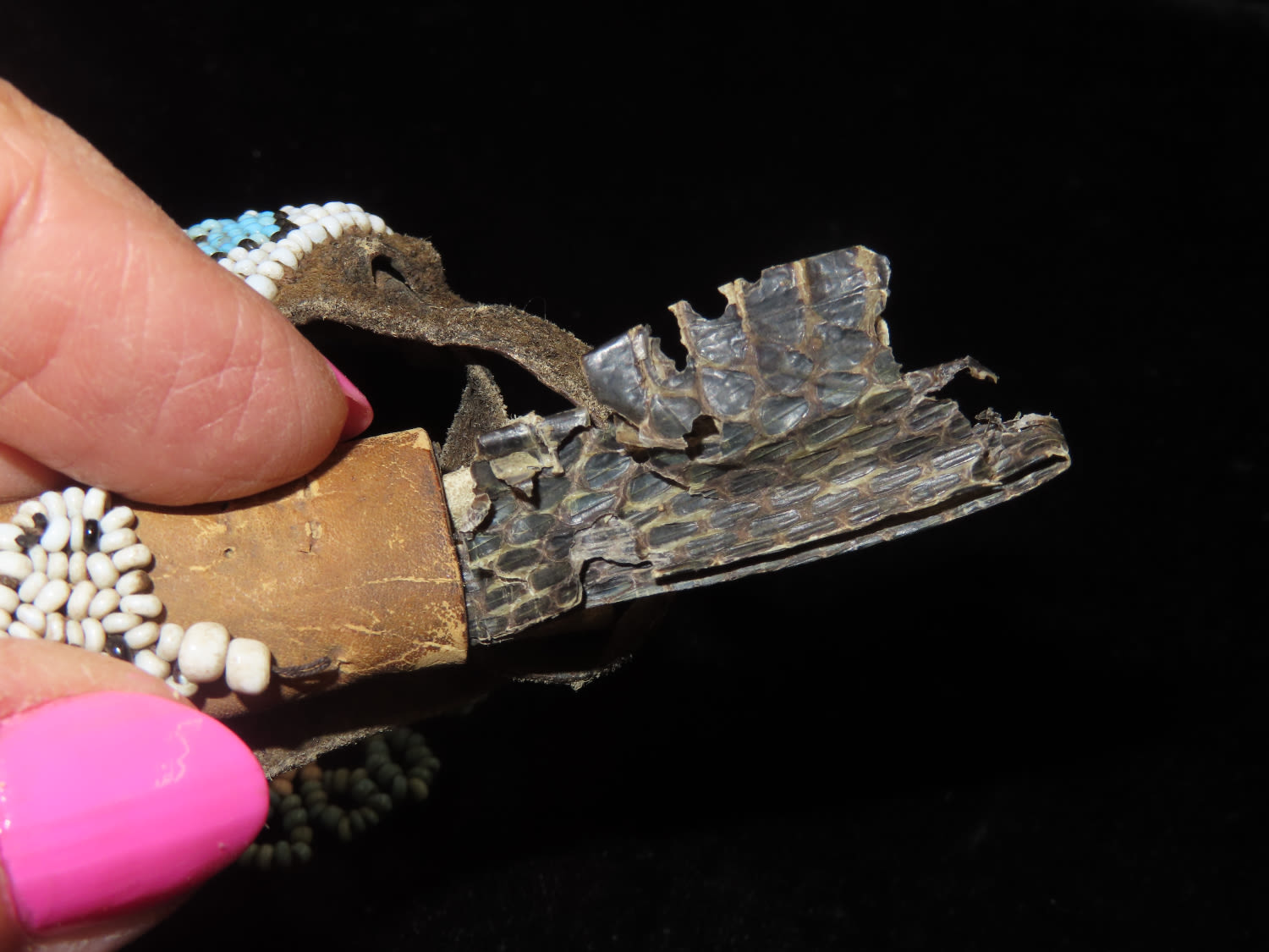 Highly Decorated Vintage Native American Quirt featuring Intricate Beadwork, Snakeskin, Carved Stone, and Metal Adornments