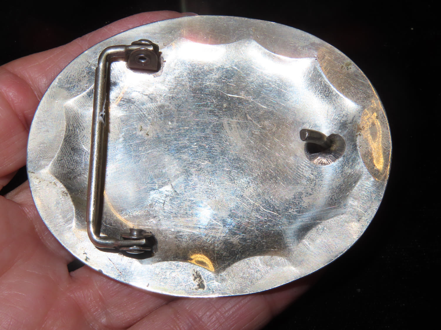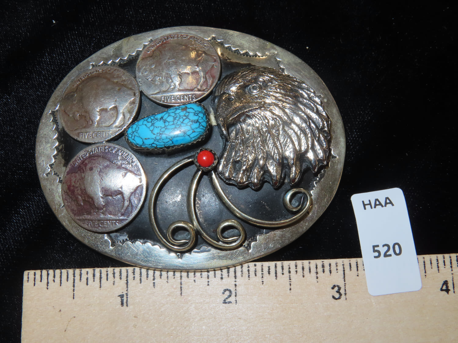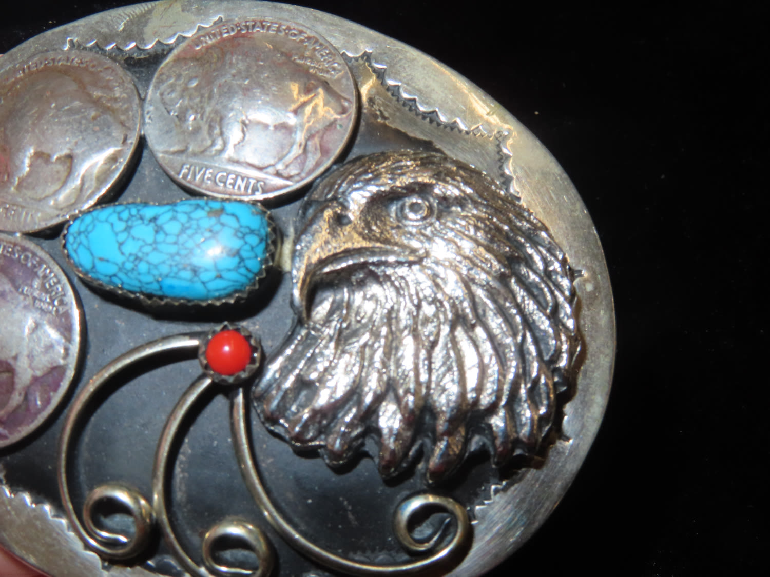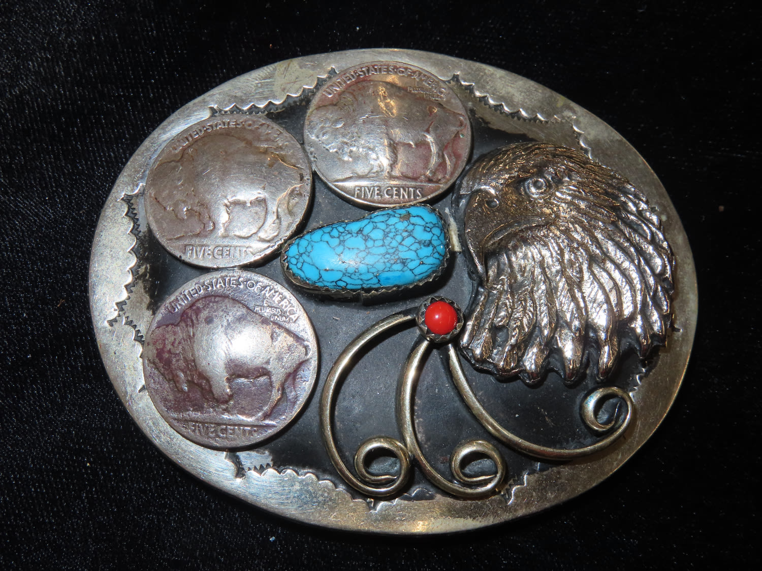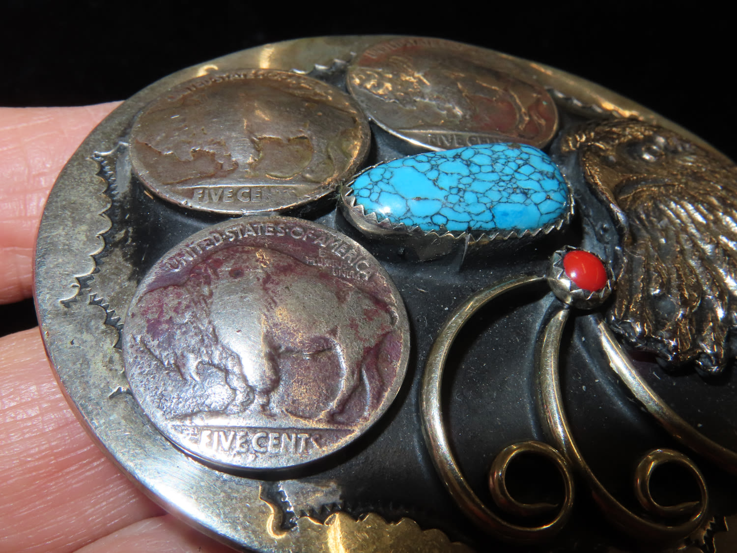 Vintage Native American Style Belt Buckle-unmarked, features 3 Buffalo Nickels, Coral(?) & Turquoise Colored Stone accents, and An Eagle