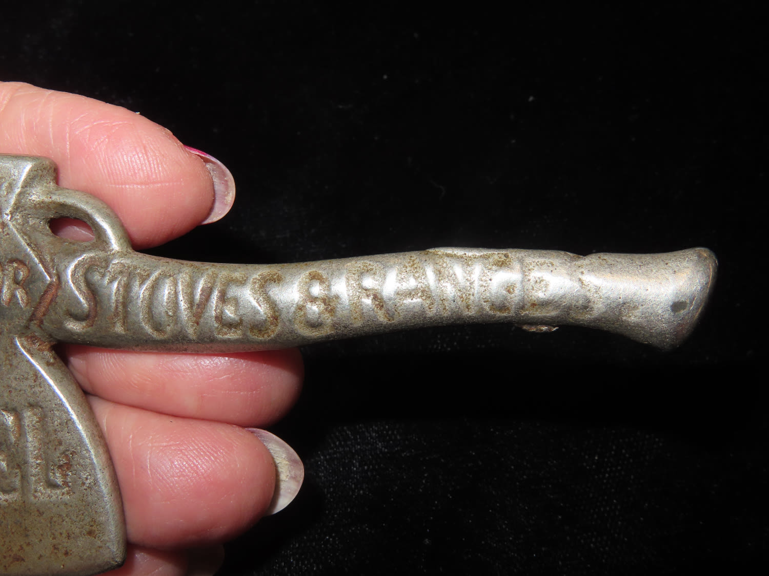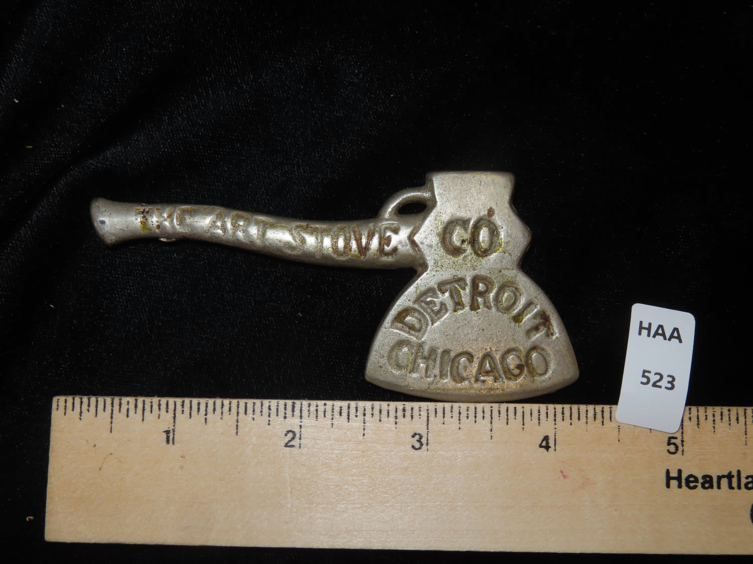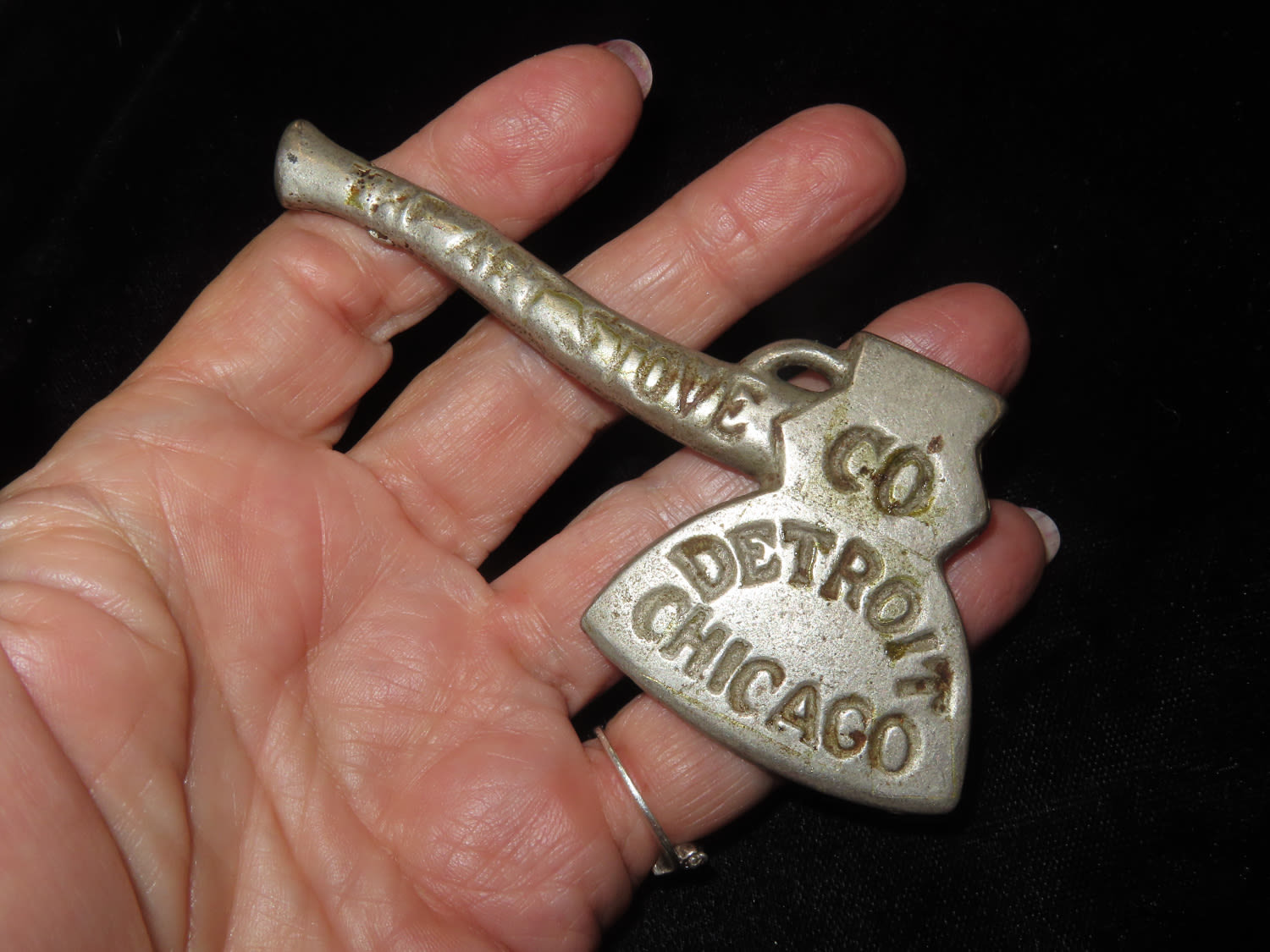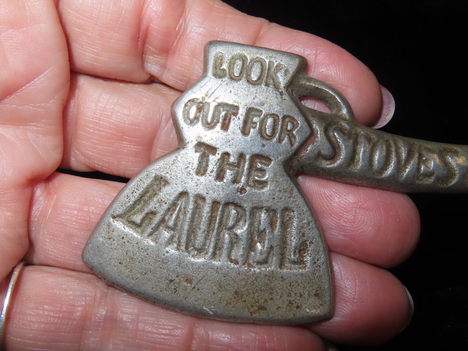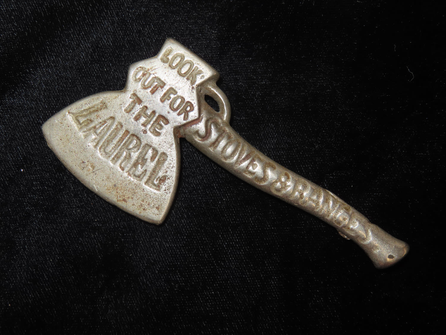 Rare Cast Iron Watch FOB Axe Advertising, The Art Stove Co Detroit Chicago “Look Out For the Laurel Stoves & Ranges”