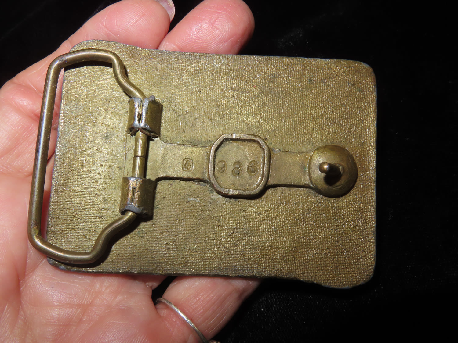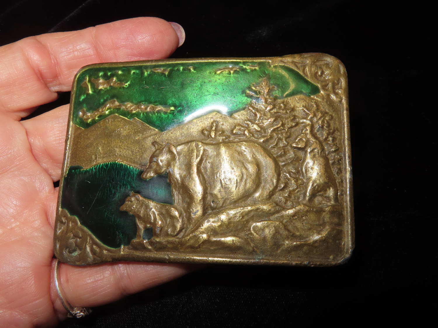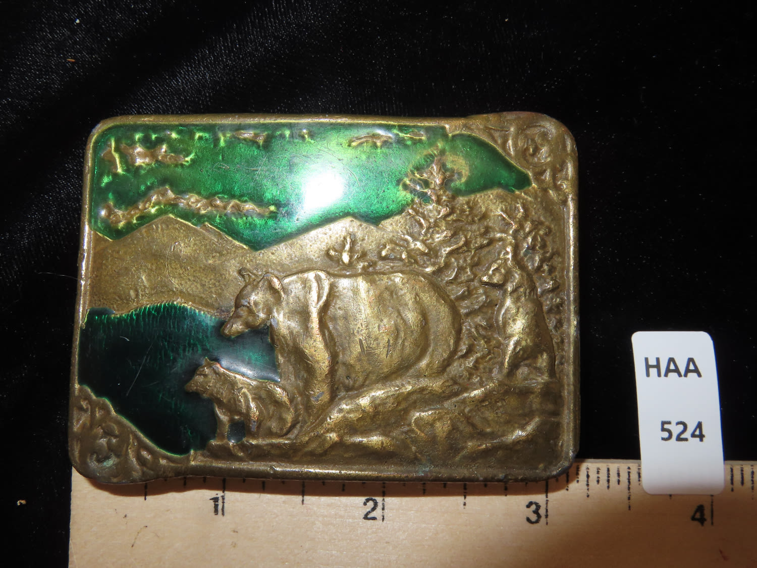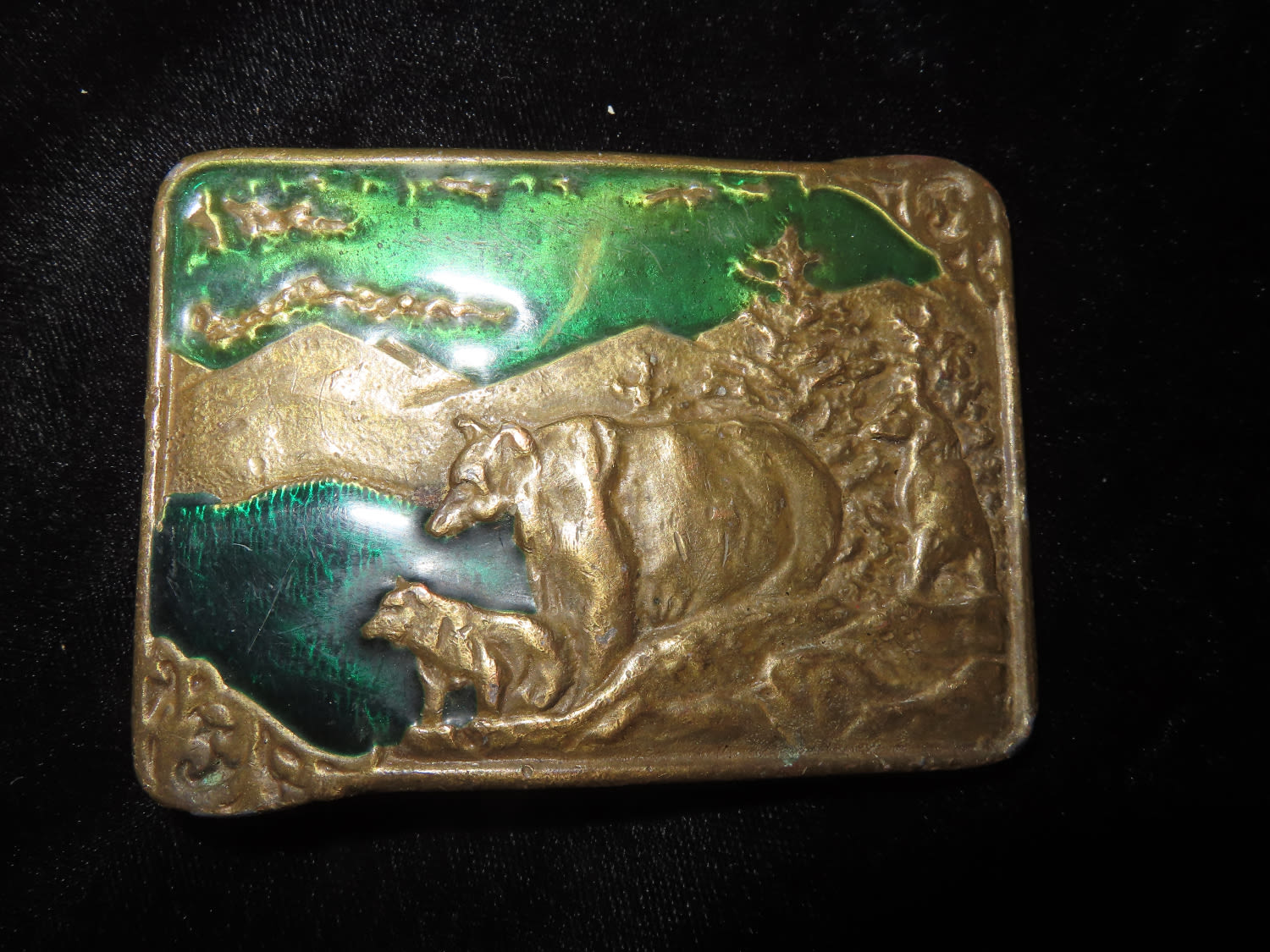 Bear w/Cub Belt Buckle-Brass-Green Enameled Accents-Marked 986-Complete
