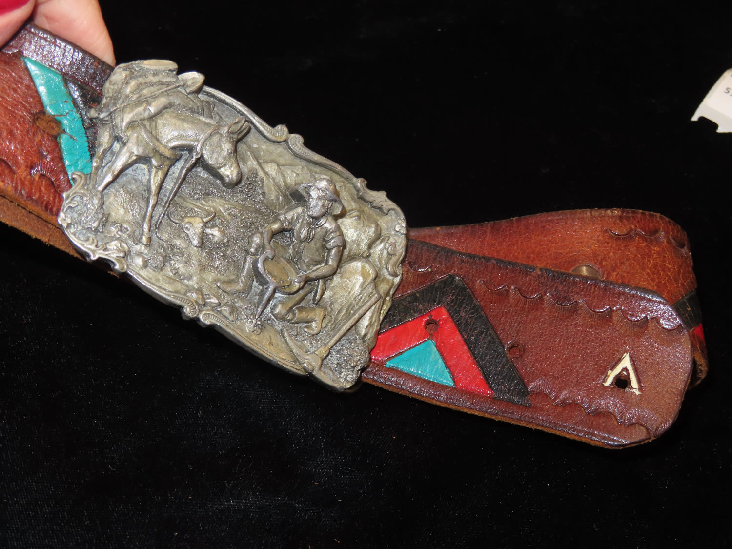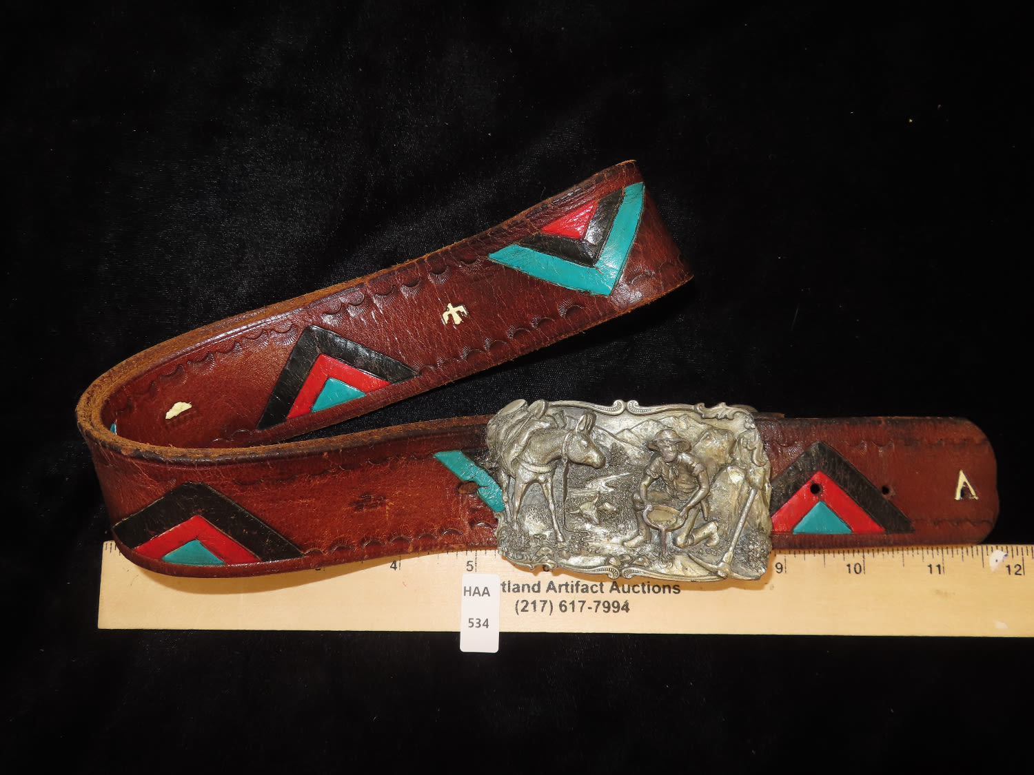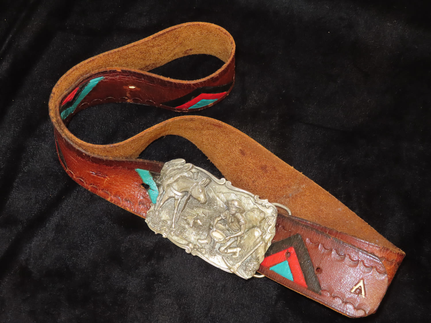 Native American Style Leather Belt with Gold Miner Belt Buckle by Arroyo Grande Buckle Co 1981