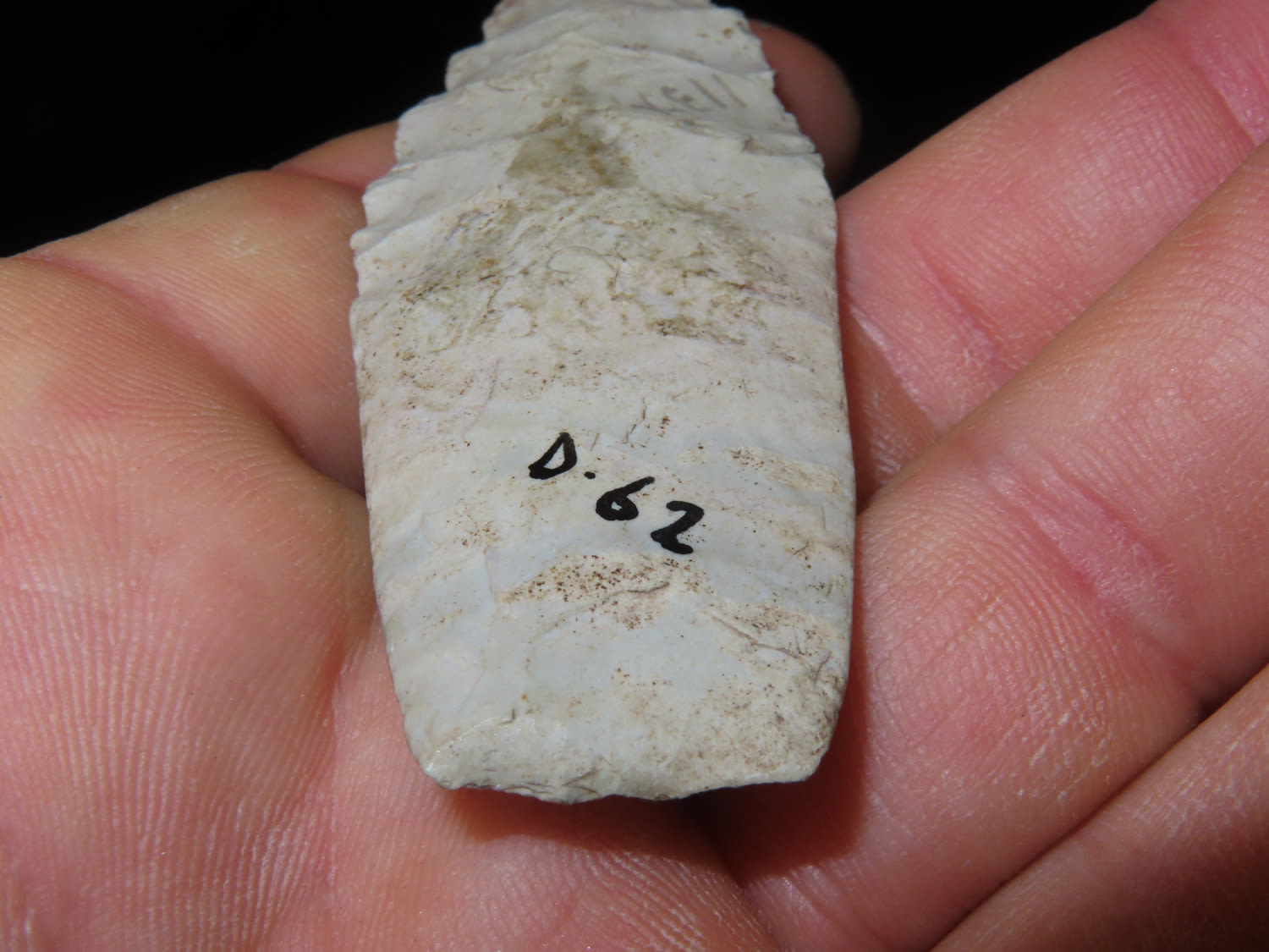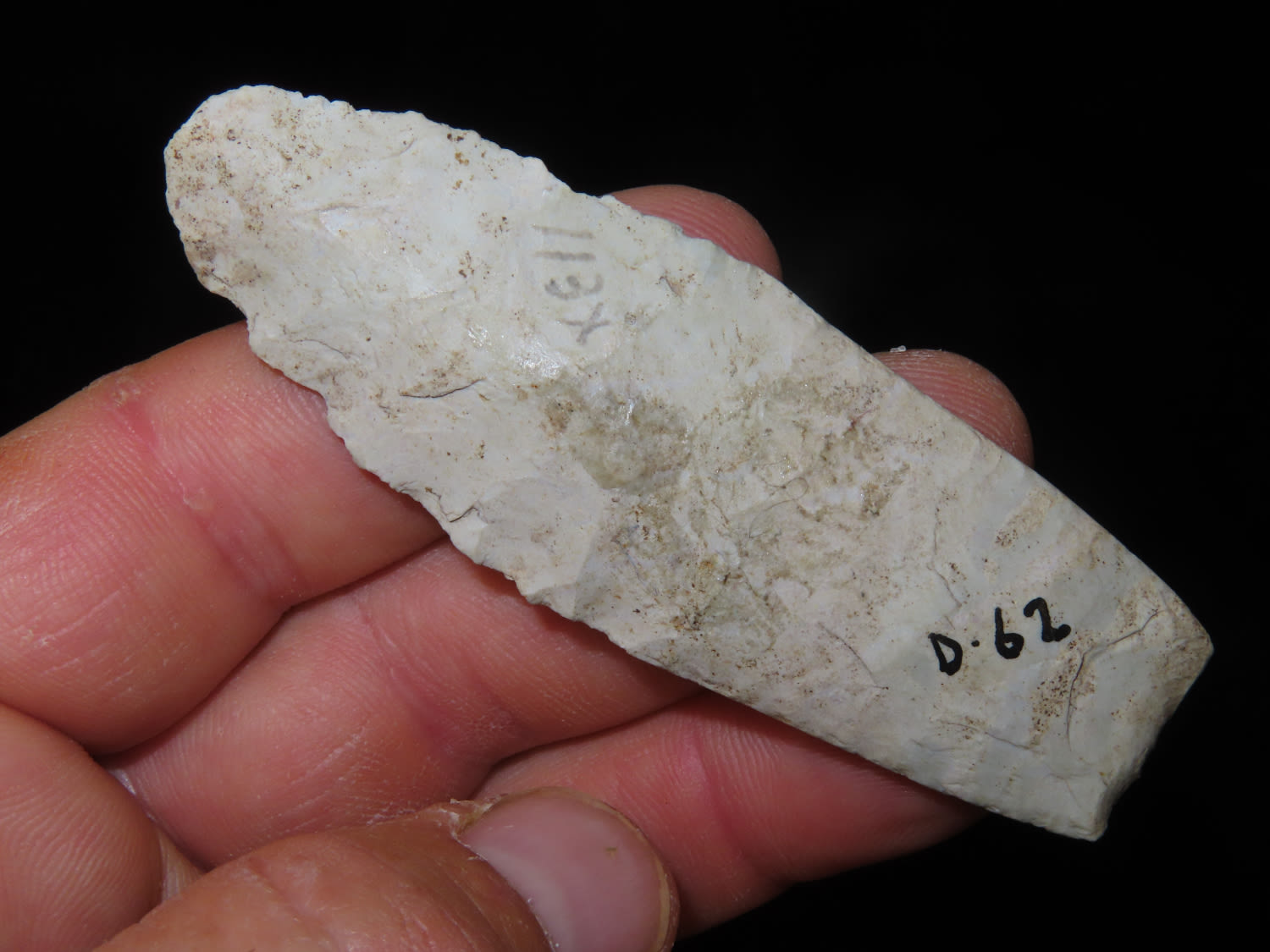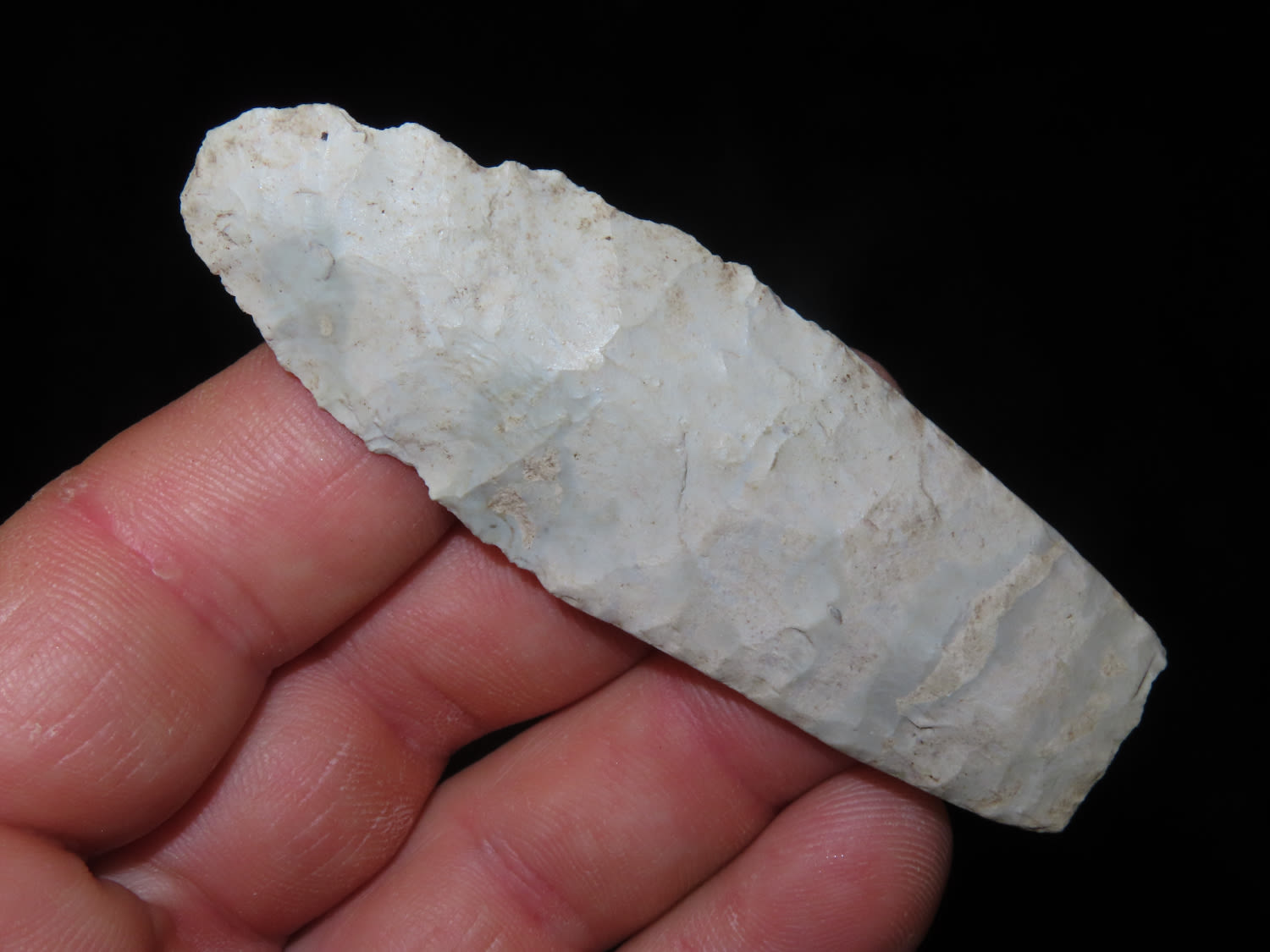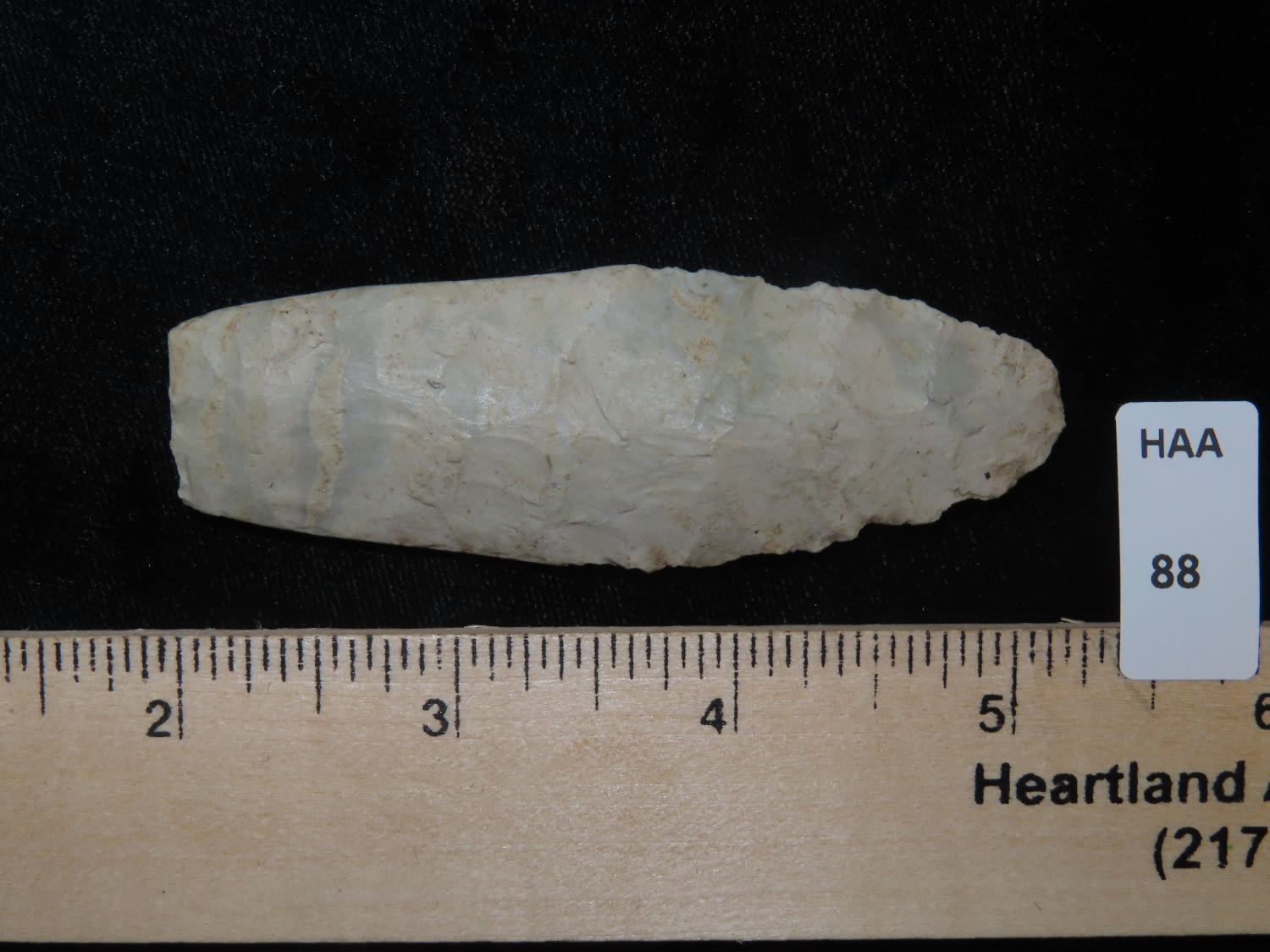 3 1/4″ Agate Basin, Heavy Grinding for 1 3/4″ of the Point, Wonderful green and grey chert Ex Robert Hruska, Wisconsin