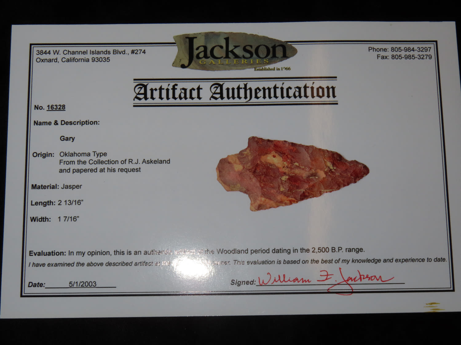 2.13/16″ Jasper Gary, Jackson COA, found in Oklahoma