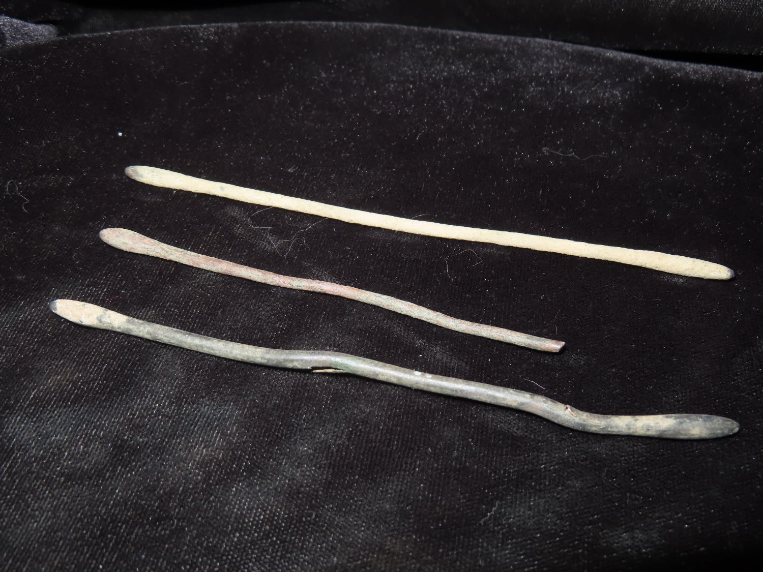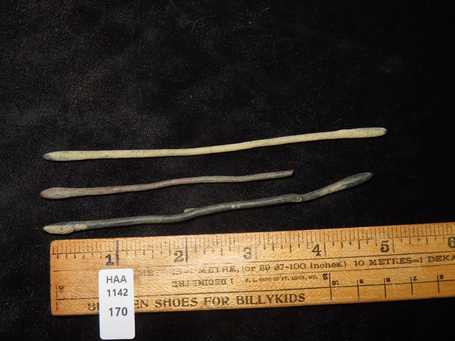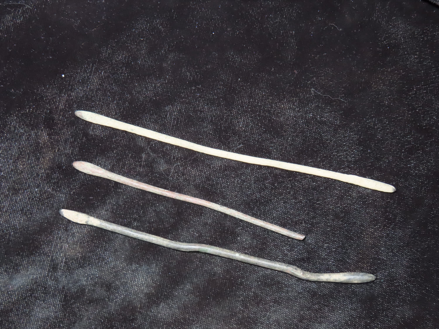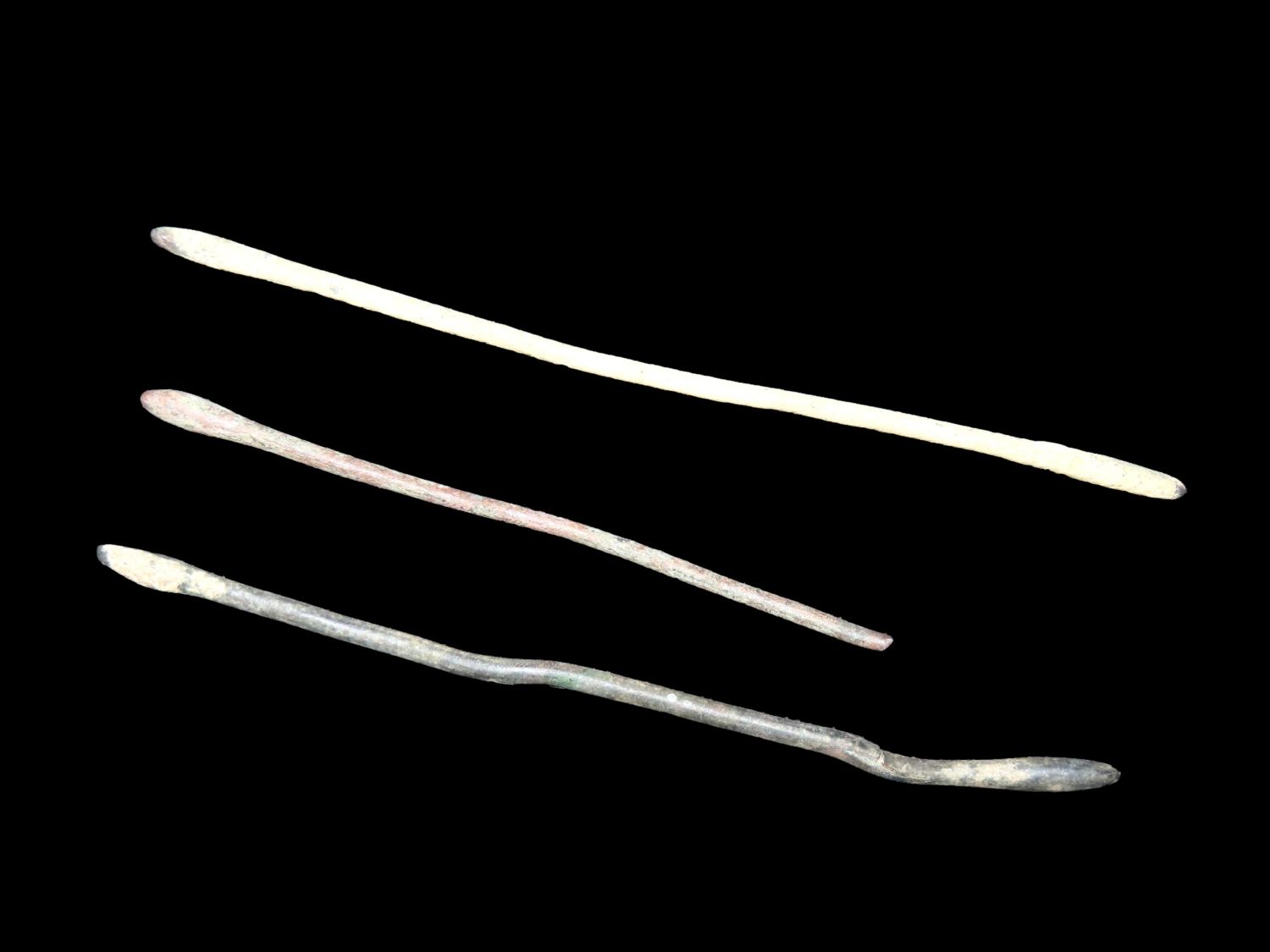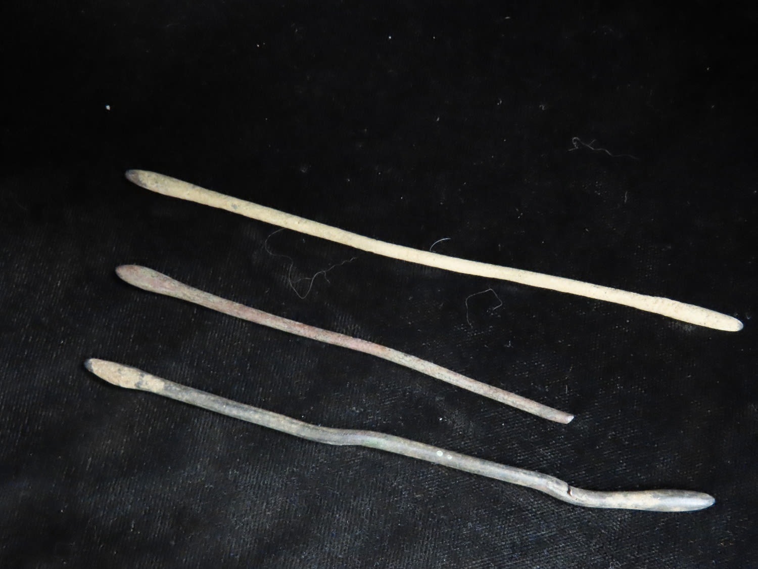 LOT OF 3 ANCIENT ROMAN BRONZE AGE DECORATIVE VIKING HAIRPIN, CLOAK PIN, AWL, TOOL, WEAPON