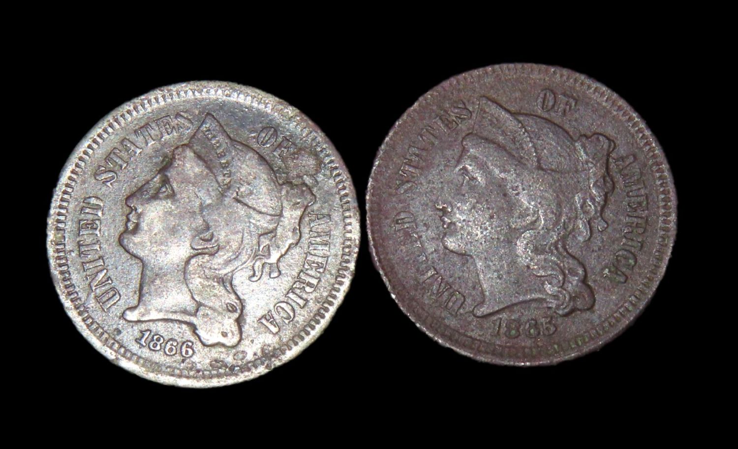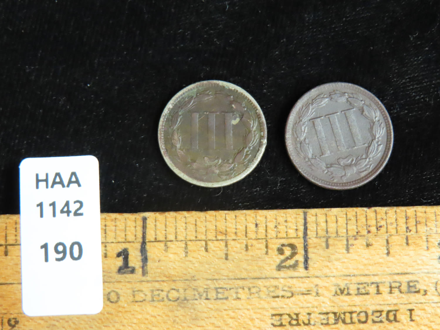 1865 & 1866 Three Cent Coins, Early American, Currency, three cents, Civil War Era