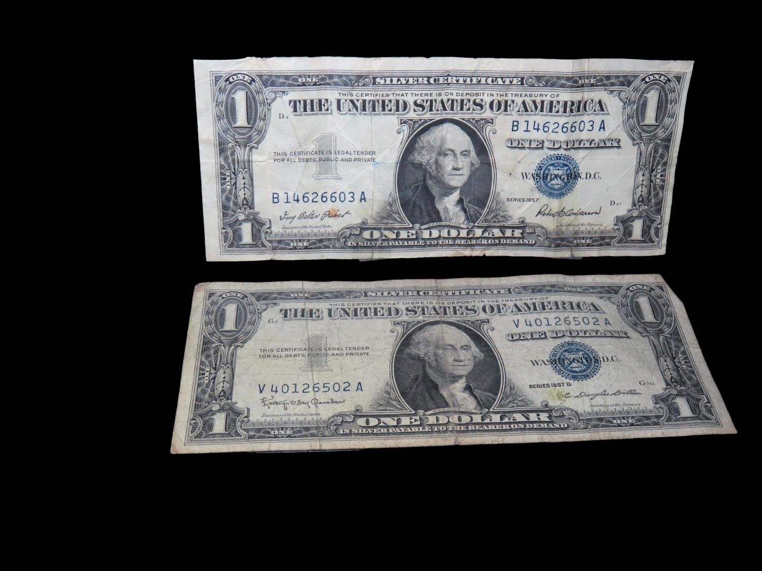 PAIR OF 1957 SILVER CERTIFICATE ONE DOLLAR BILLS, US CURRENCY
