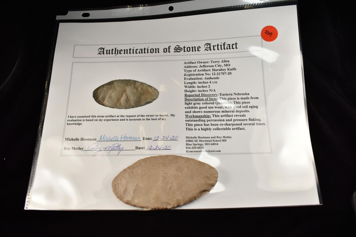 4 1/16" Harahey knife, Motley COA, Found in Eastern Nebraska. Native American Artifact