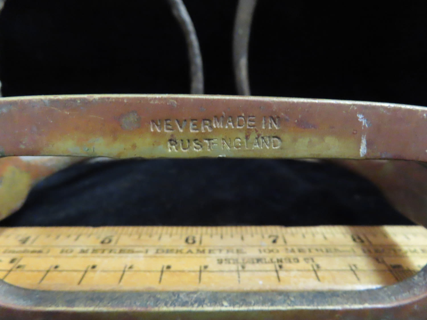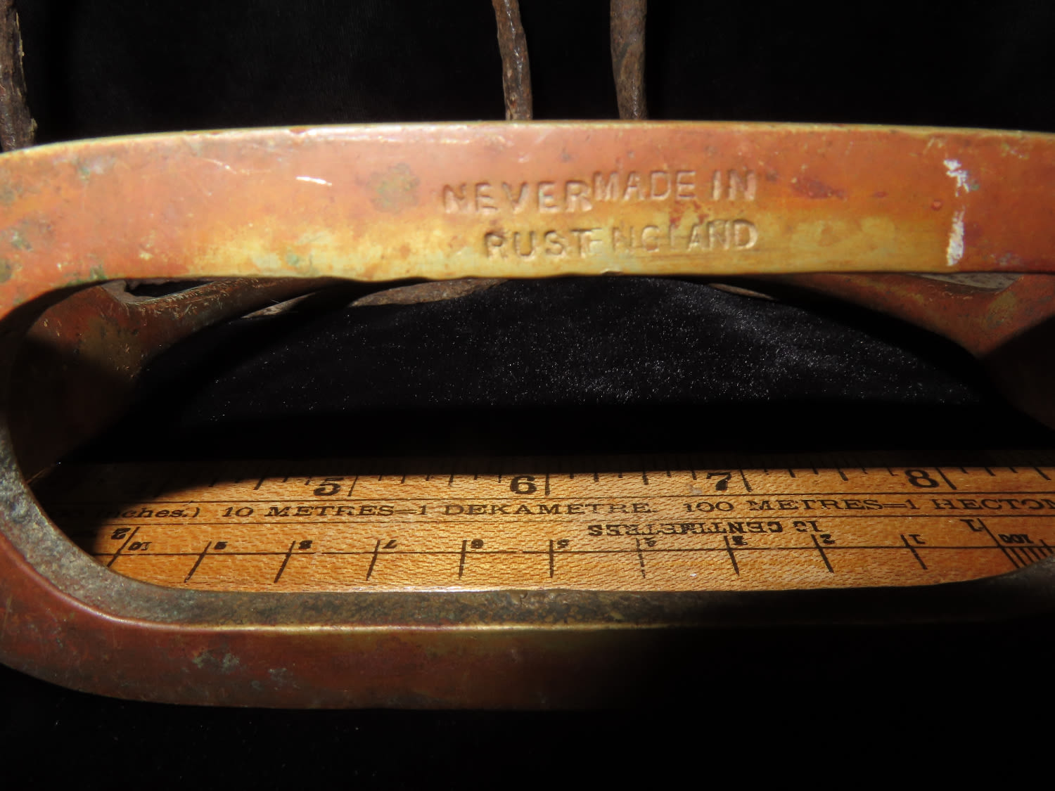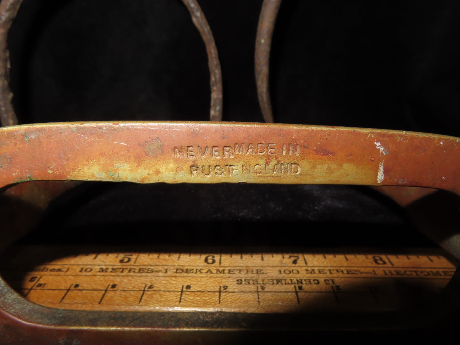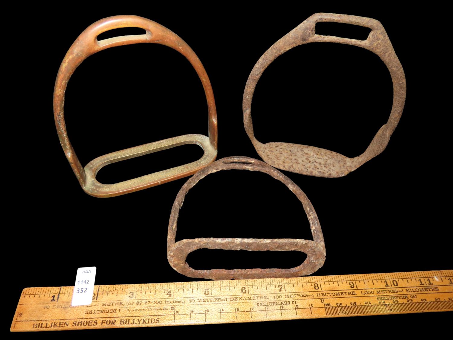 Group of 3 Stirrups, metal, possible 2 iron and 1 brass. Brass is marked ‘NEVER RUST MADE IN ENGLAND’