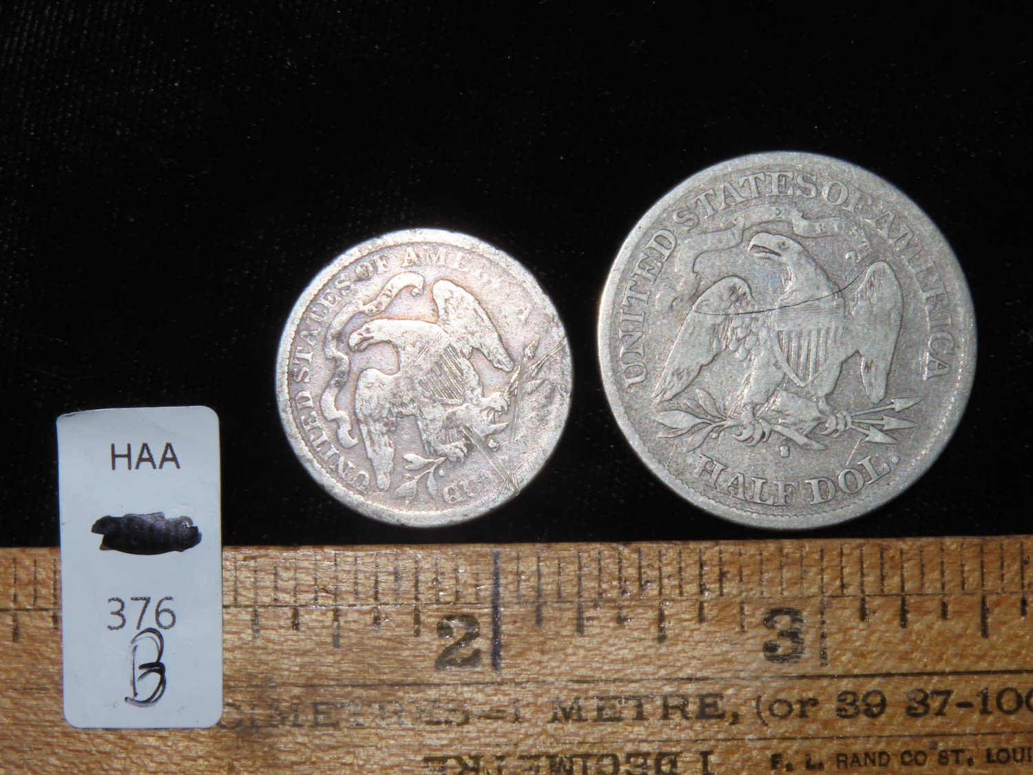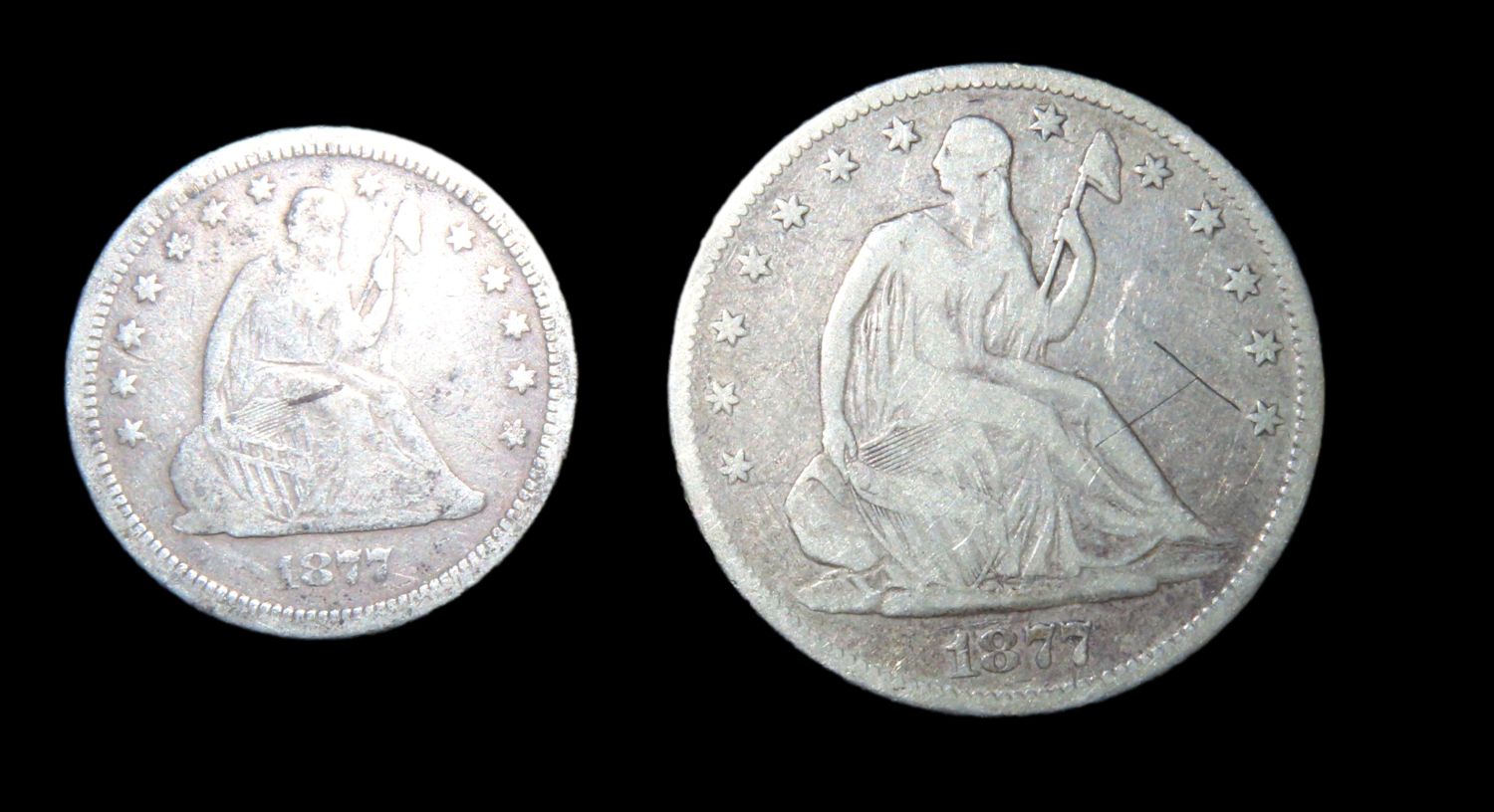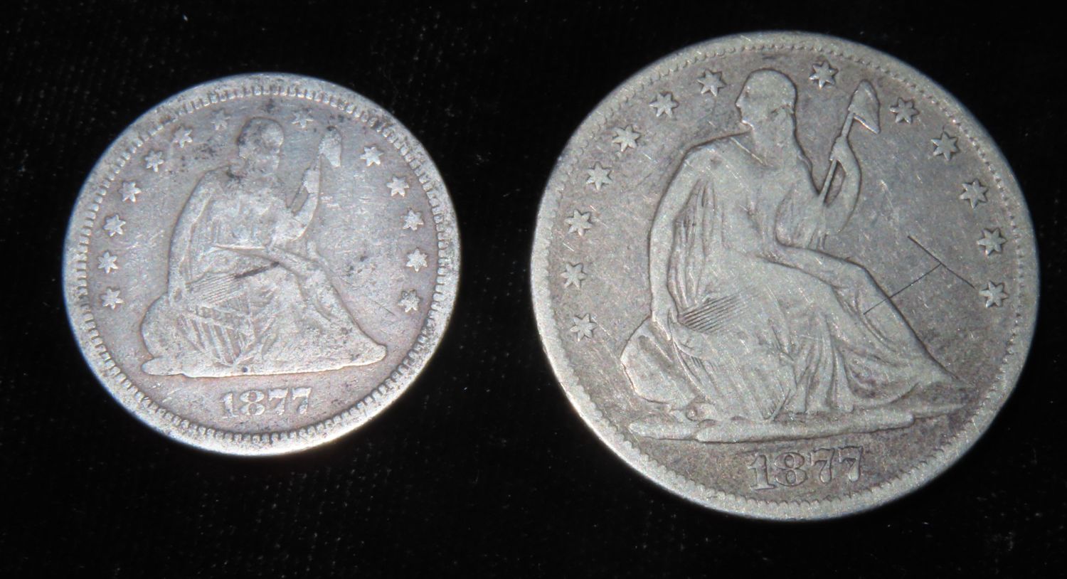 SET OF 2 1877 COINS, ONE HALF DOLLAR, ONE QUARTER DOLLAR