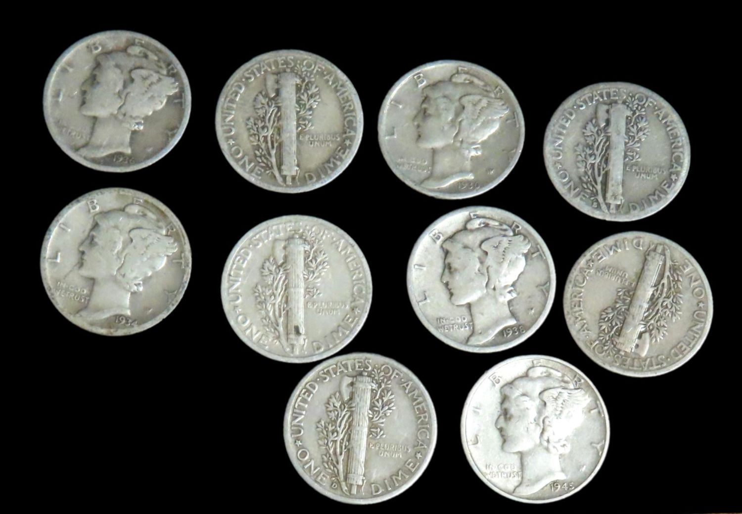 LOT OF 10 EARLY MERCURY SILVER DIMES, 1934, 1935-S, (4) 1936, 1938, (2) 1939, 1945, ONE OUNCE WORTH OF SILVER