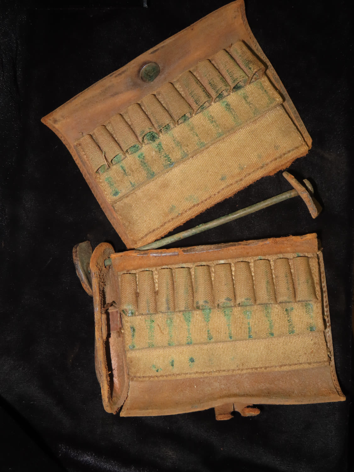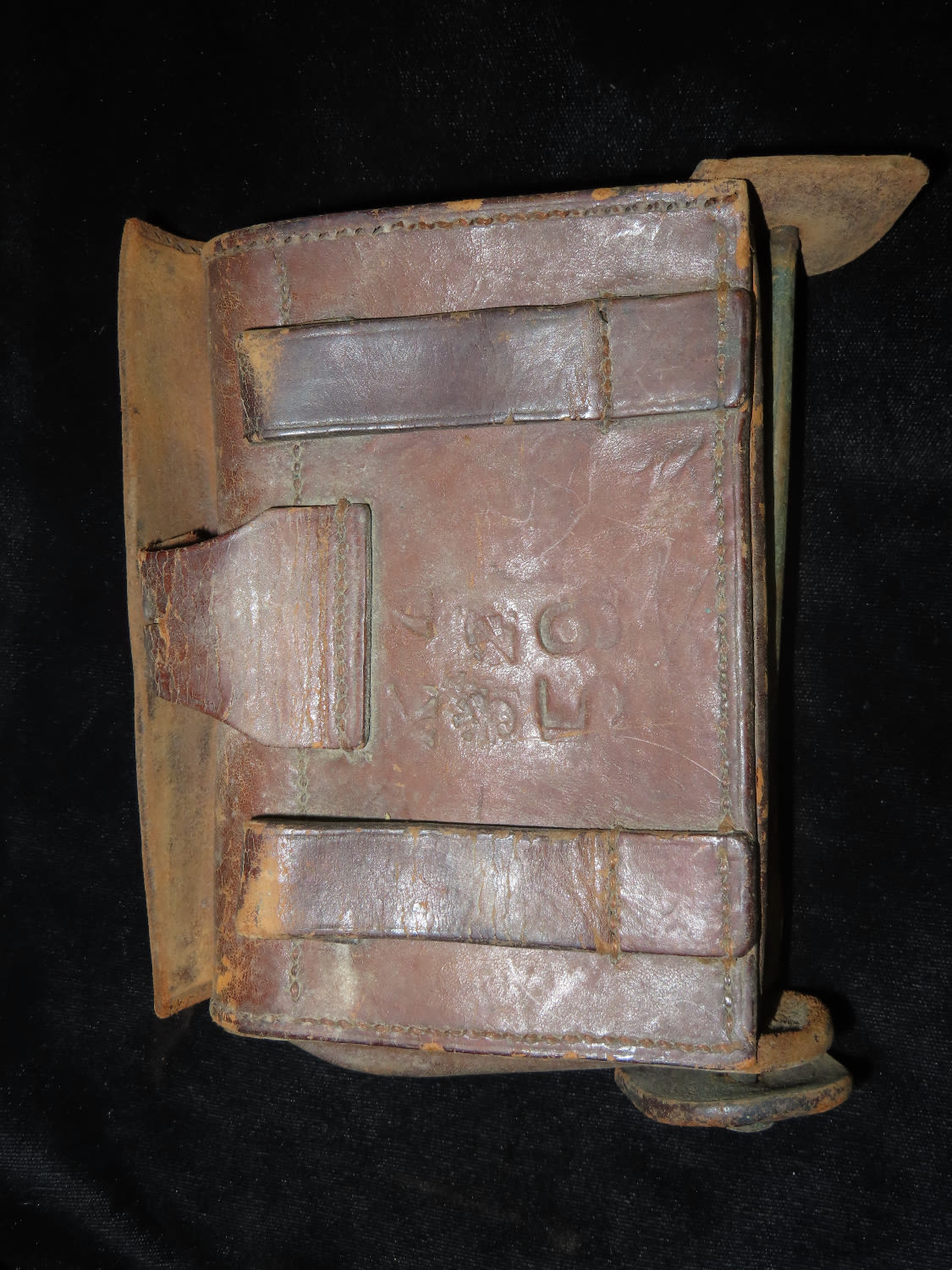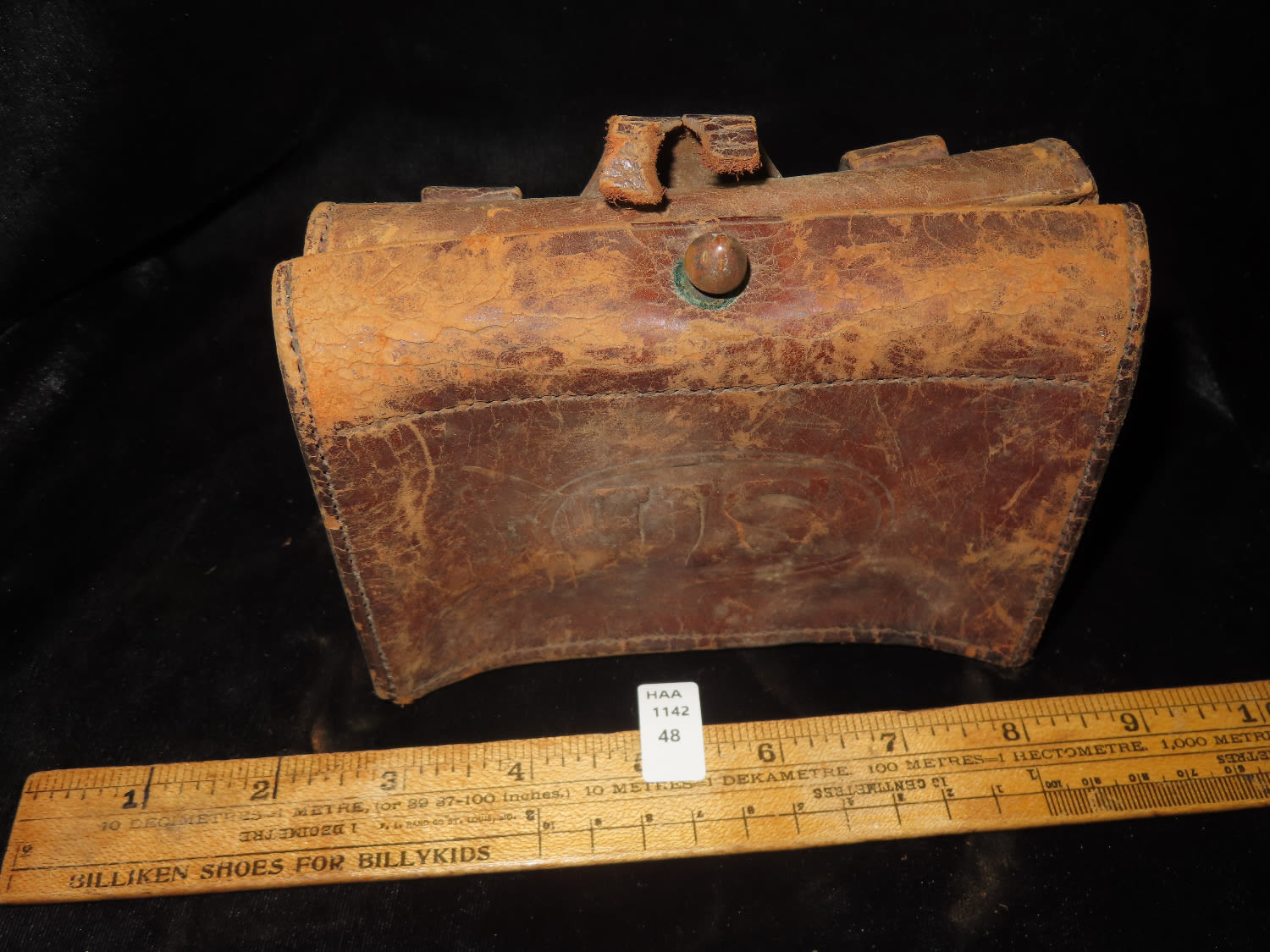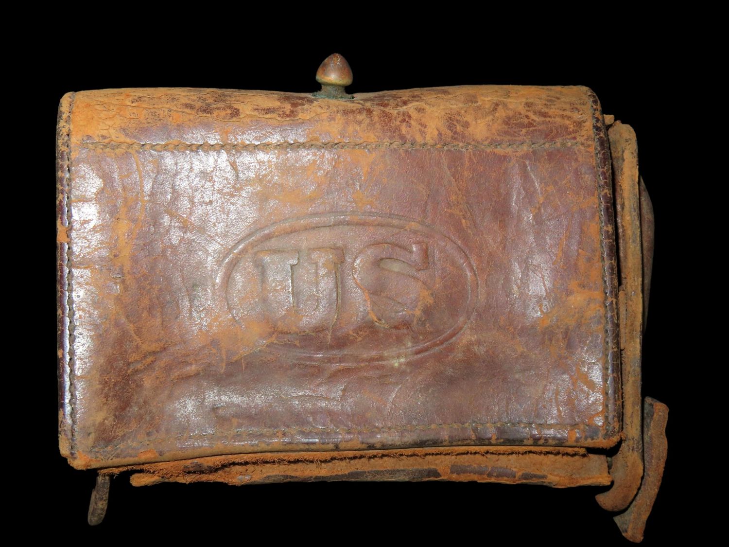 ORIGINAL CIVIL WAR ERA US ARMY ISSUED AMMO POUCH, LEATHER, WITH “US” LOGO ON FRONT- not in great shape, but all there.