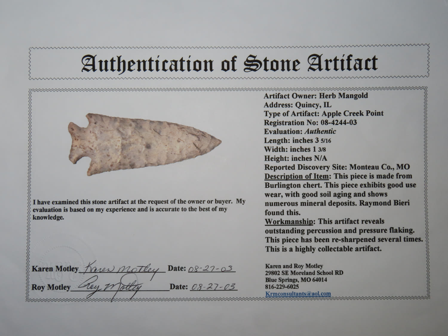3.5/16″ Apple Creek Point, Motley COA, Monteau Co MO,