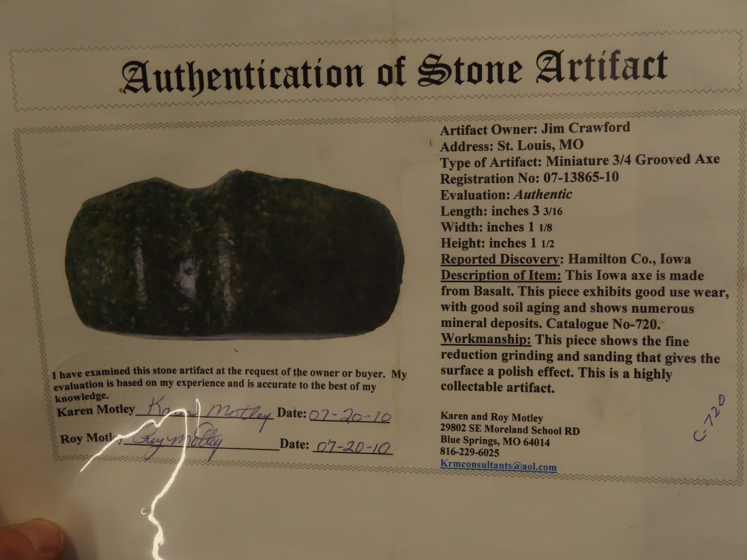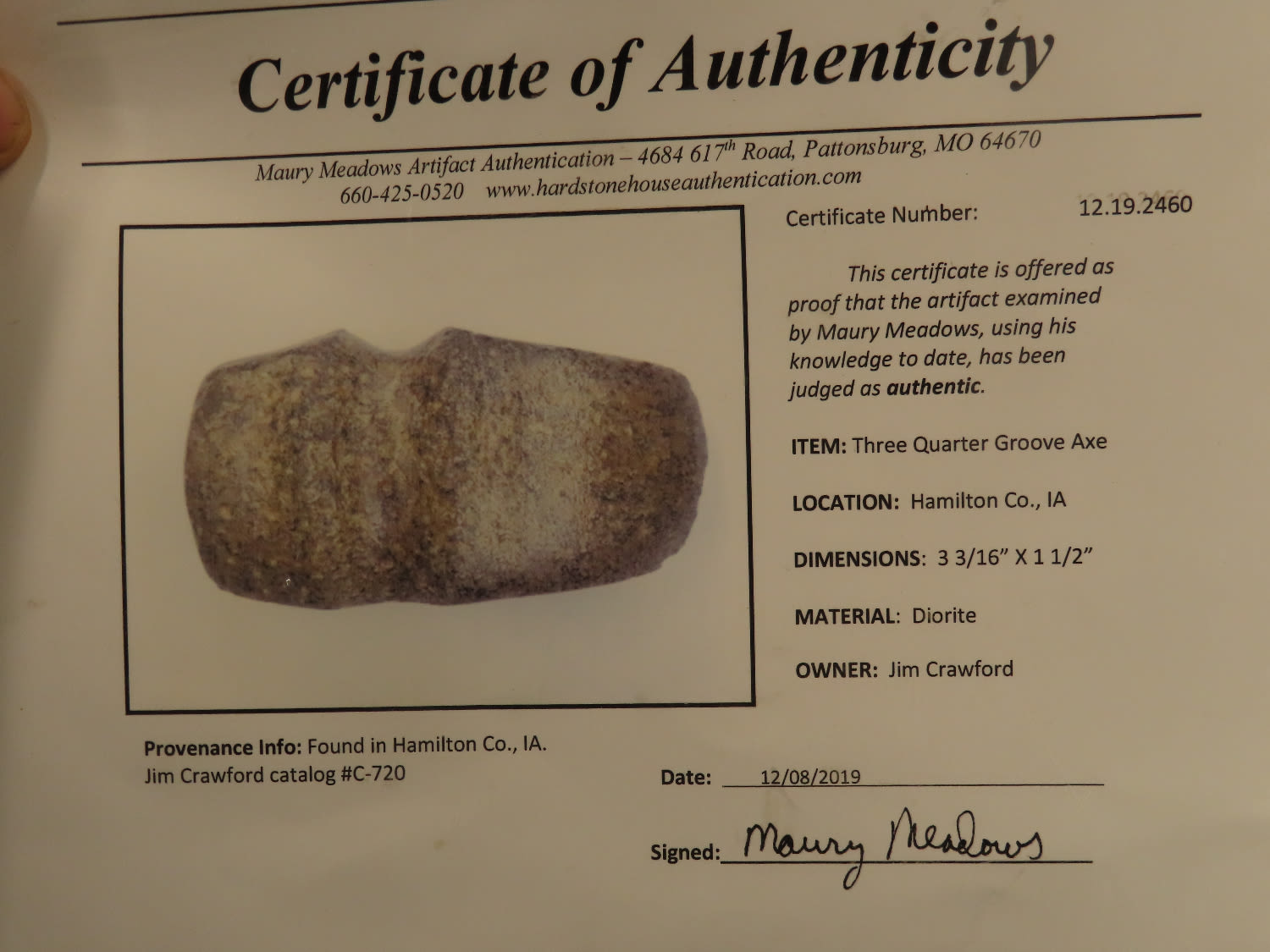 3.3/16″ Minature 3/4 Groove Axe 2x COA, Motley and Meadows, found in Hamilton County Iowa, Super Nice Frameable Small Axe. Ex Jim Crawford