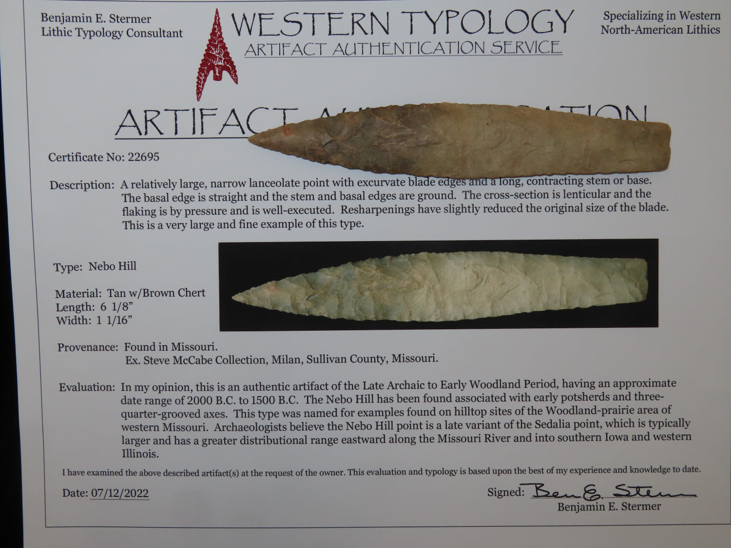 6.1/8″ Nebo Hill, Stermer COA, found in Missouri, Ex Steve McCabe Collection