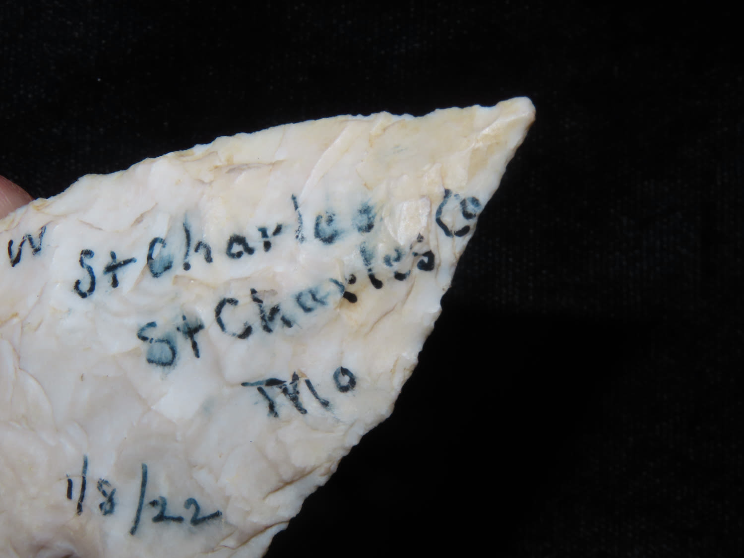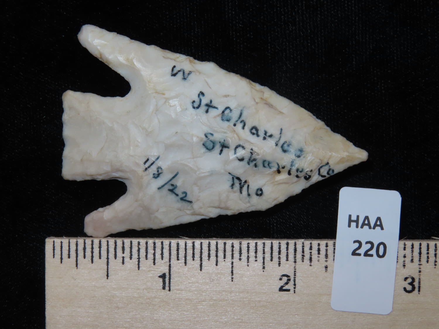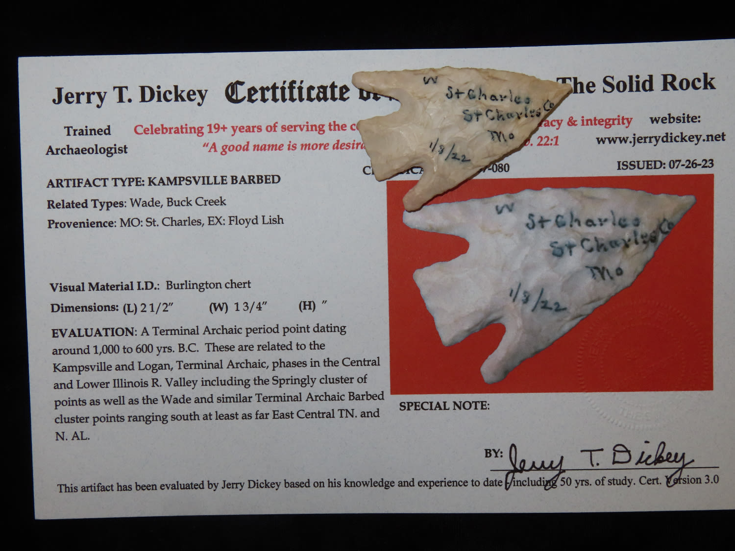 Kampsville Barbed point w/ Dickey COA, Super Ears, 2.1/2″ long found in St Charles Missouri