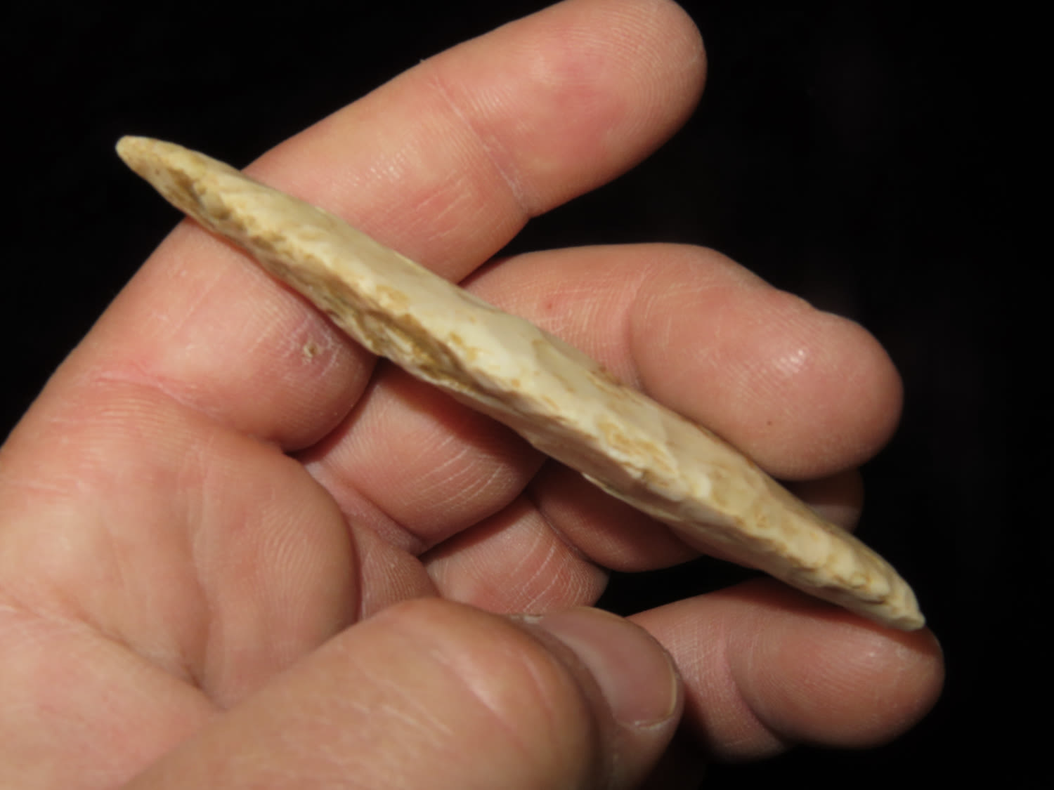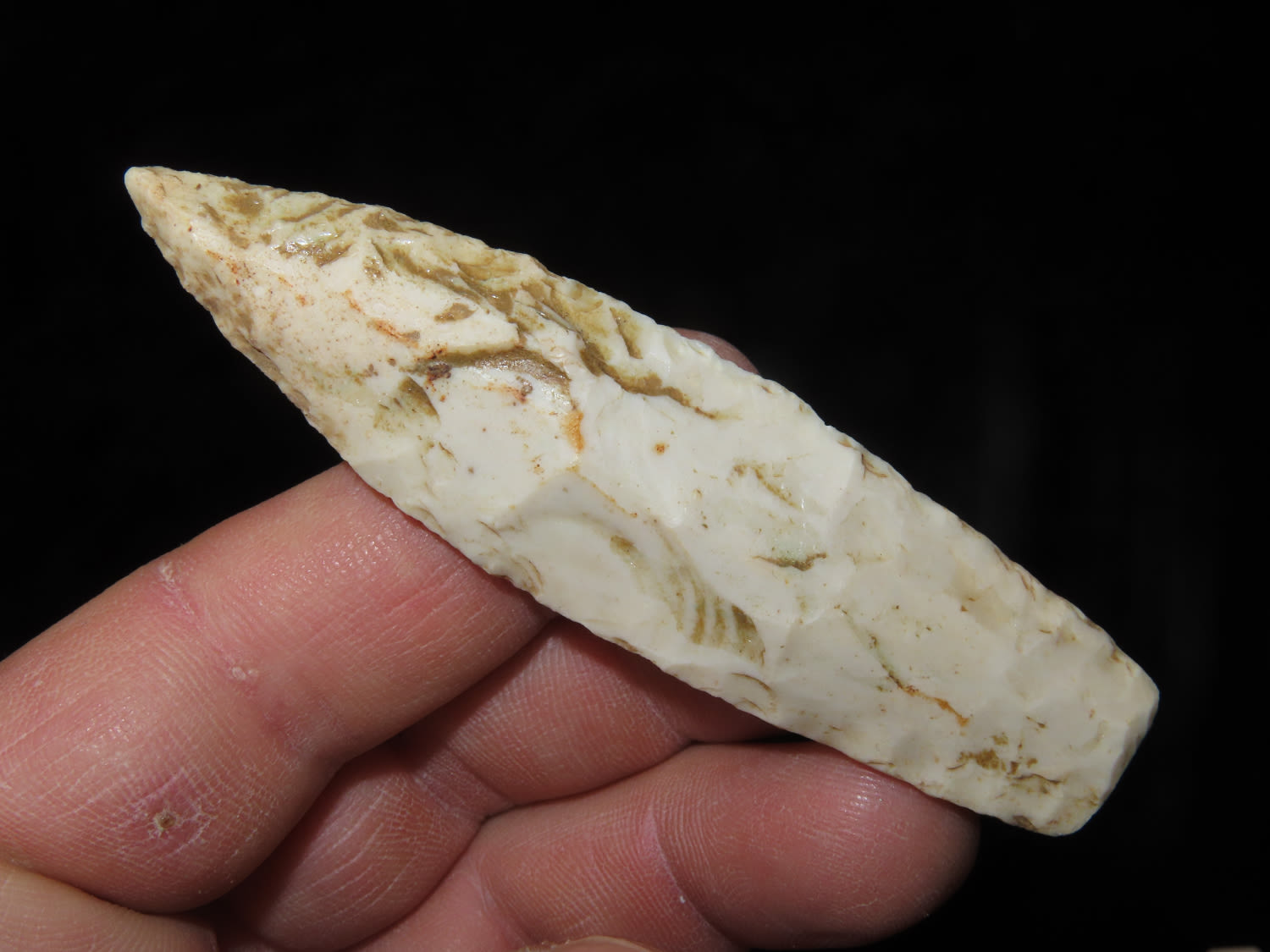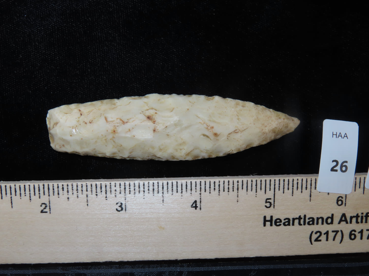 3.3/8″ Paleo Lancelot, Ground base for about 1/2 of the point, Found by Gary Wilkerson on the Wilkerson Farm, Perry Illinois, Pike County.
