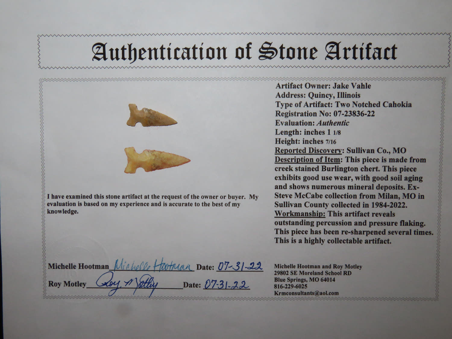 1.1/8″ Cahokia, Motley COA, Ex Steve McCabe Collection