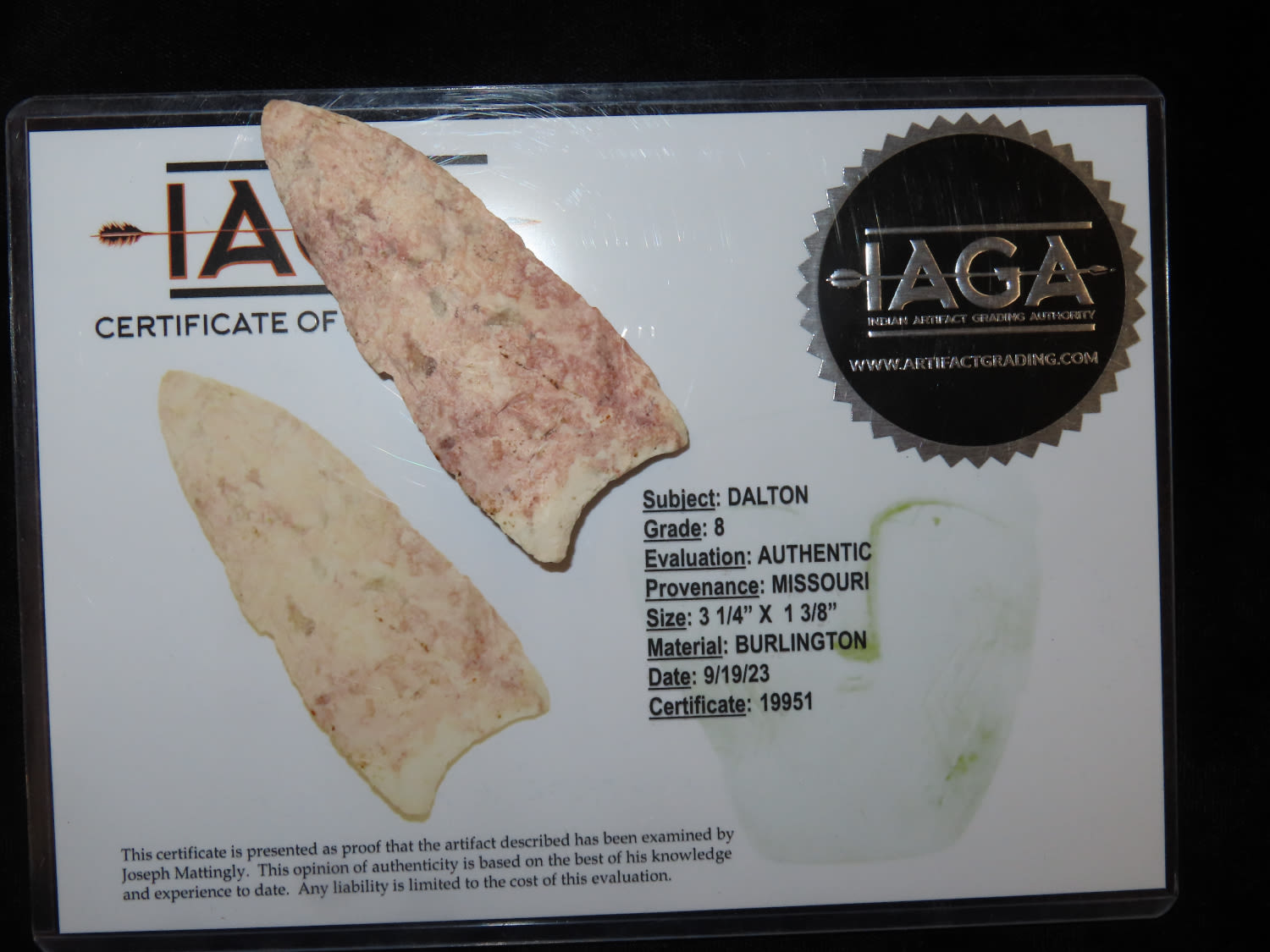 3.1/4″ Dalton, Missouri, IAGA COA, Heartland Artifact Auctions believes this to be a modern point, this item selling no returns as is