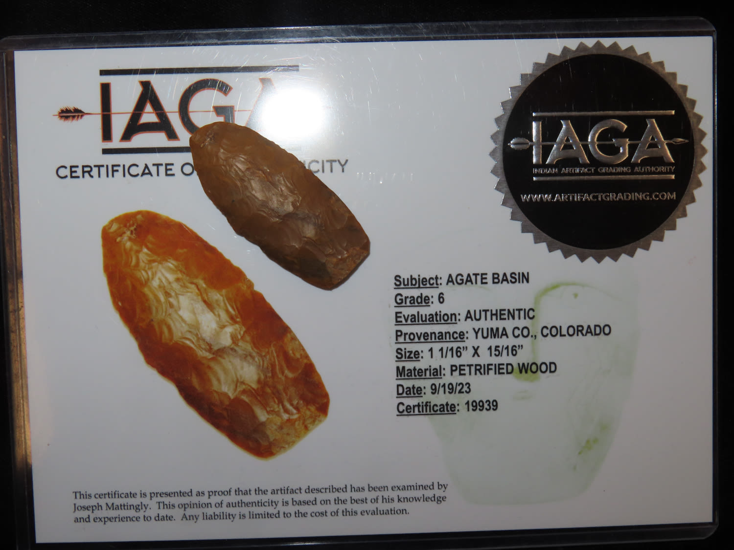 1.1/16″ Agate Basin, Yuma Co Colorado, IAGA COA