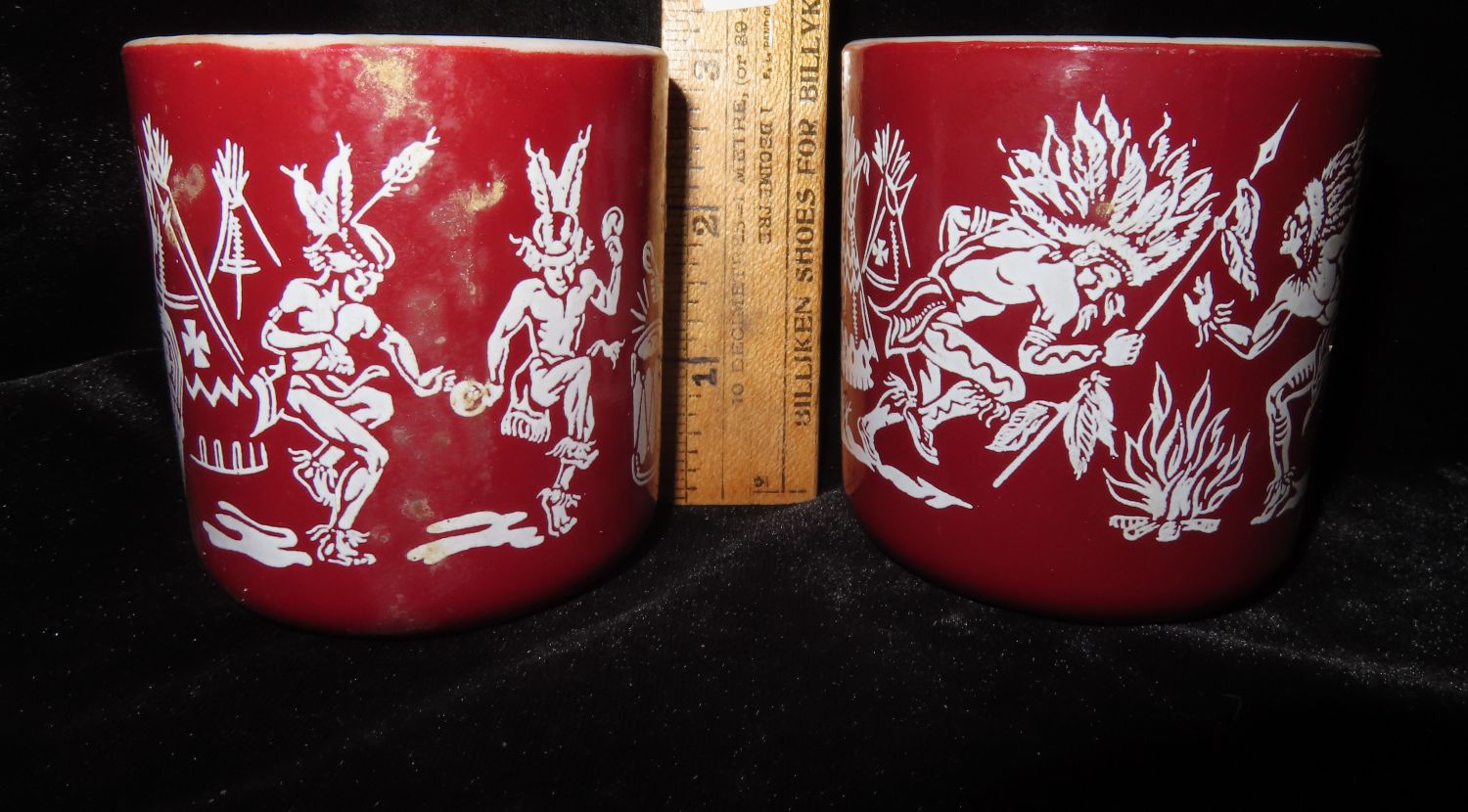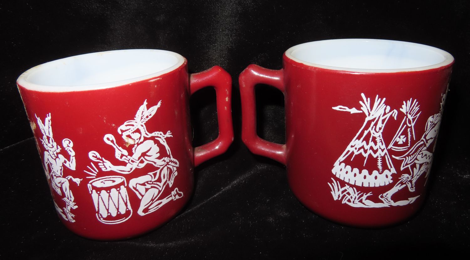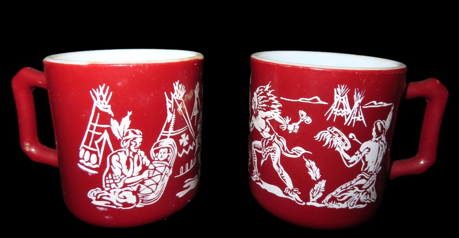 Set of 2 Hazel Atlas Childrens Mugs, Native American Themes- Buffalo/TeePee/Horses/Etc.- from the 1950’s, good used condition