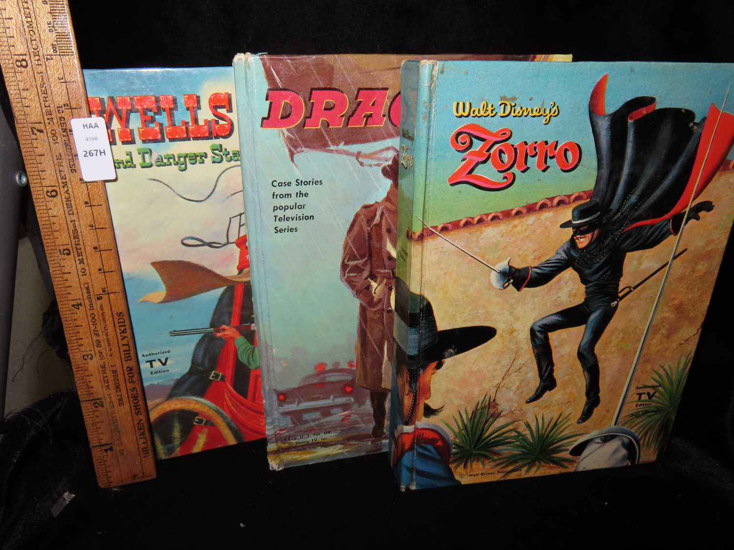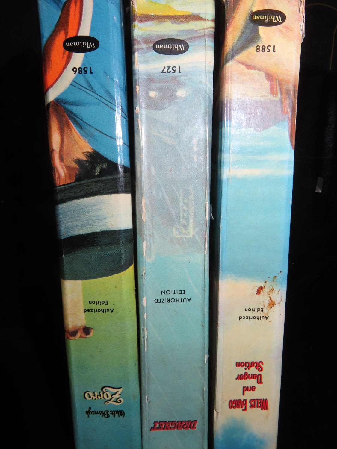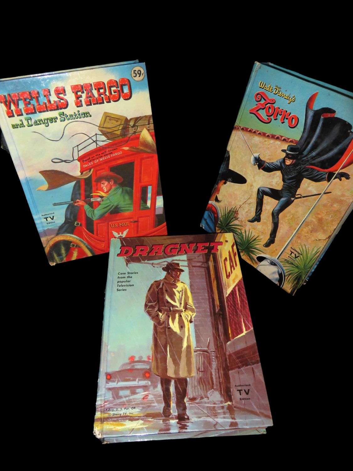 Set of 3 Authorized TV Edition Books-“Walt Disney’s Zorro”, “Dick Tracy”, and “Wells Fargo and Danger Station”. Printed by Whitman Publishing in the 1950’s for children. Full Color Binding is in decent condition, with tinted illustrations throughout.