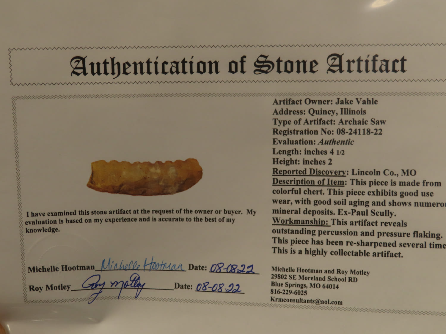 5.1/2″ Archaic Wadlow Saw, Rare Relic, Motley COA, Found in Lincoln Co Missouri, Ex Paul Scully