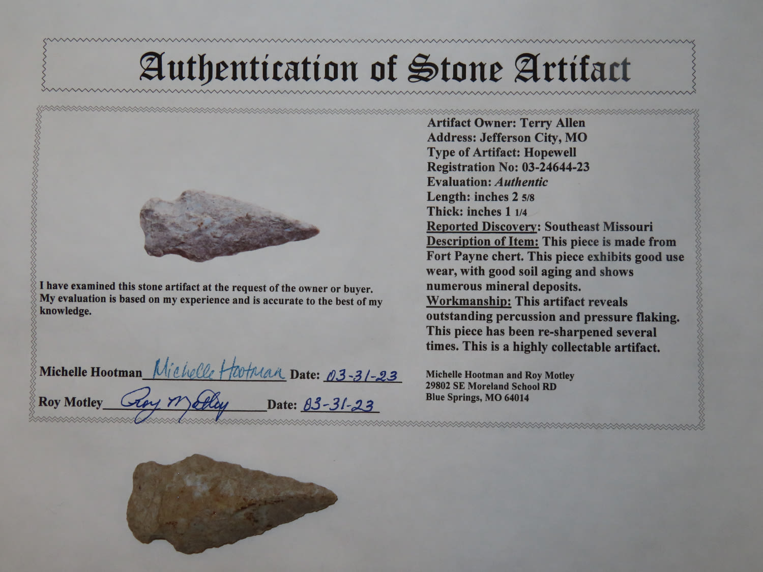 2.5/8″ Hopewell, SE MO, Motley COA