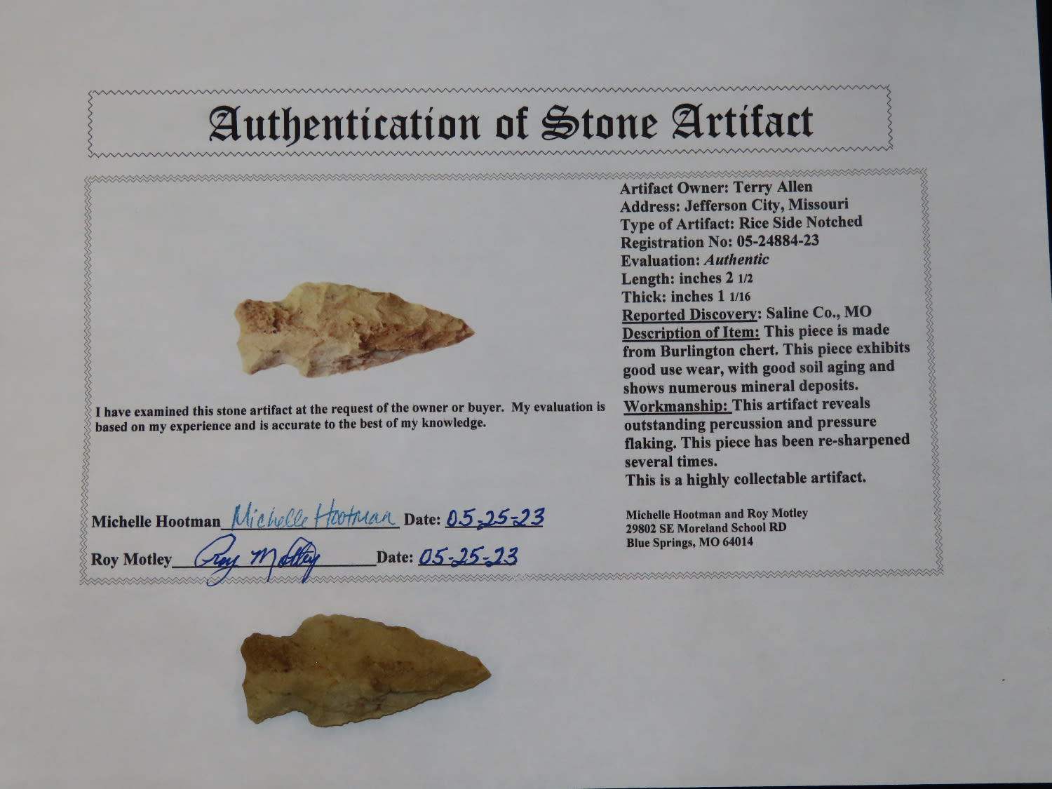 2.1/2″ Rice Side notched, Saline Co MO, Motley COA