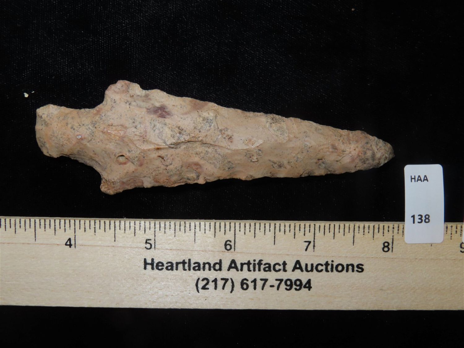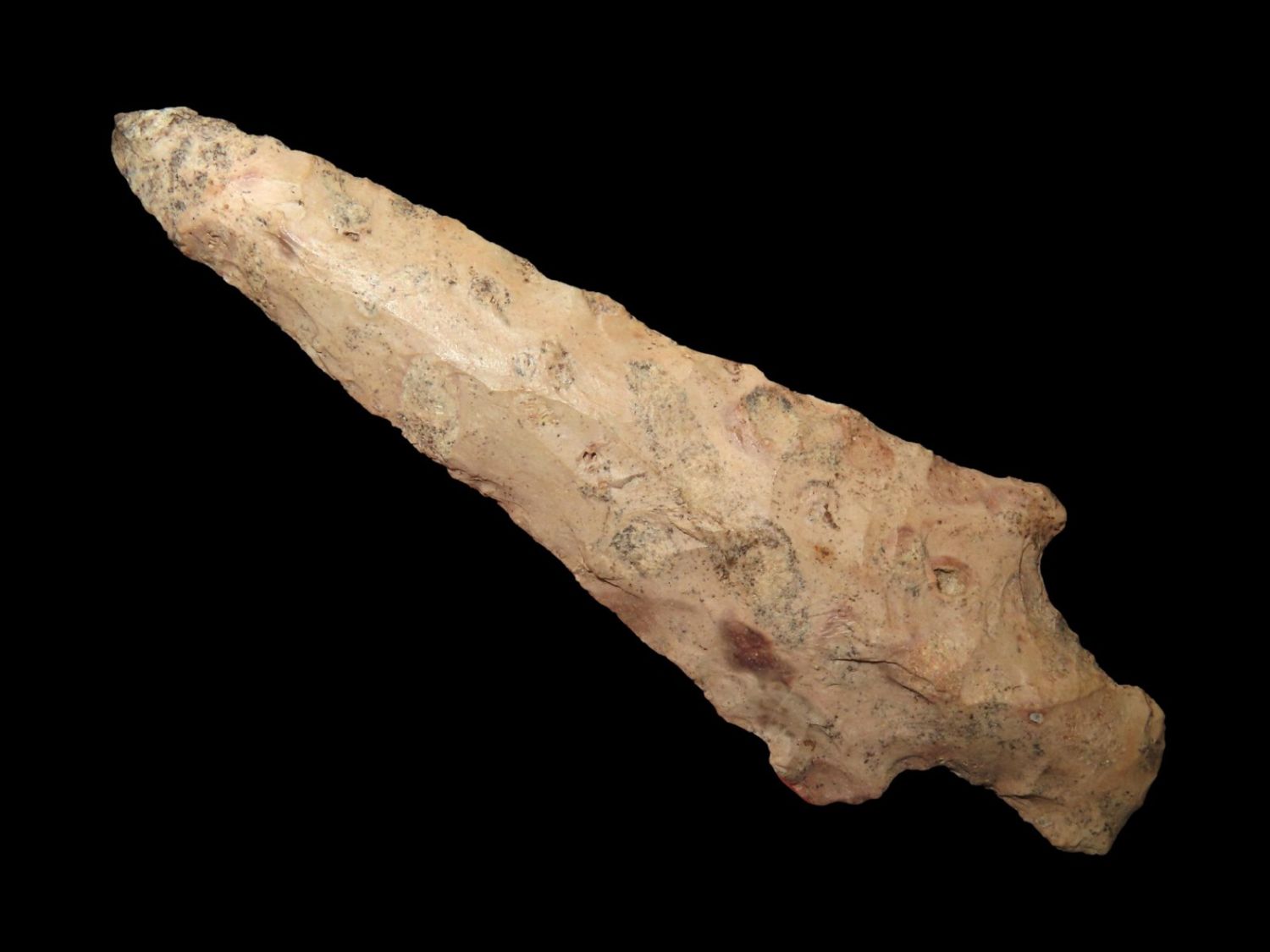 4.1/2" Stemmed Point, Large Colored Relic, This collection was the property of the Leonard & Vivian Nelson Estate. They were life long farmers in the Dekalb County Illinois area with ancesteral roots in the Dekalb area for generations beginning in the mid 1800’s.