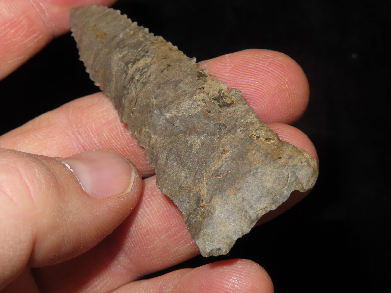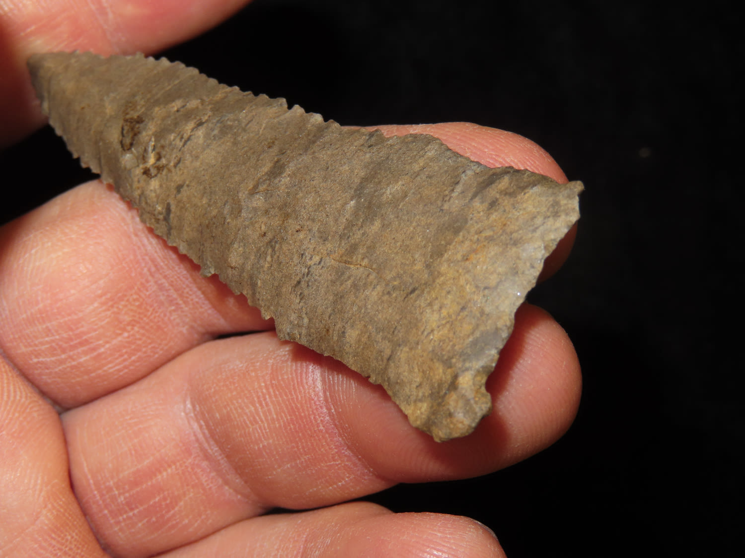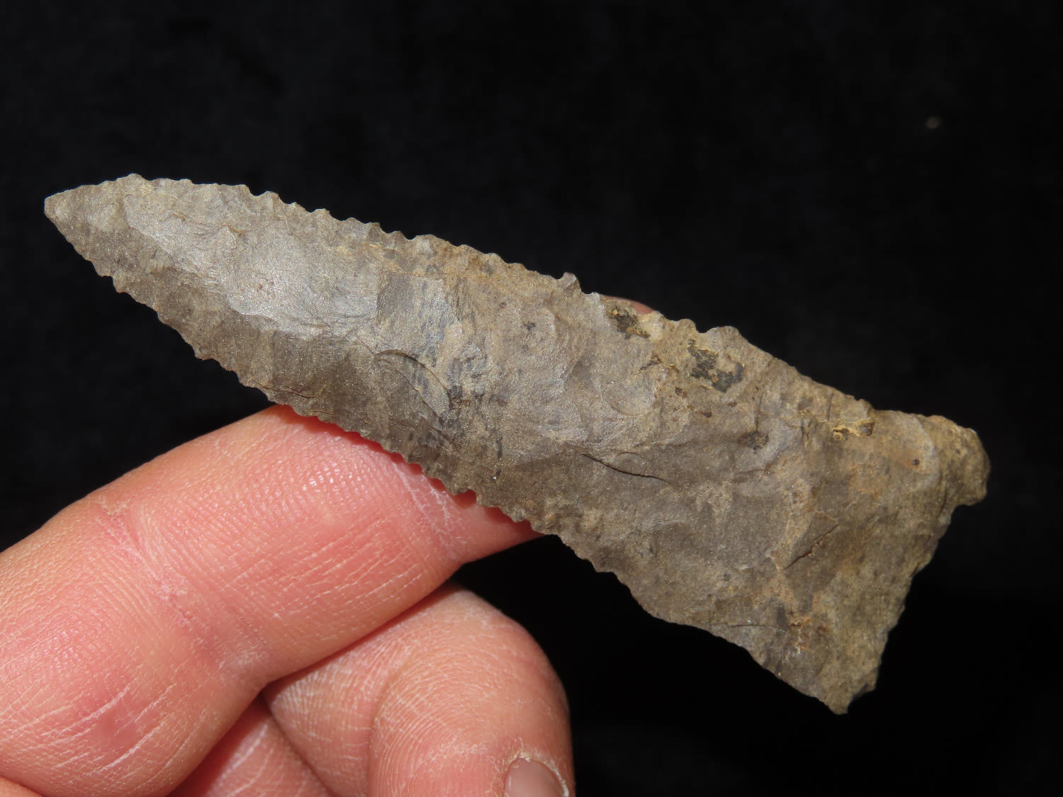 3" Paleo Point, Ground Base, Dover Chert, Serrated, Ex Mike Hosier, Ex Montie Milner Collection