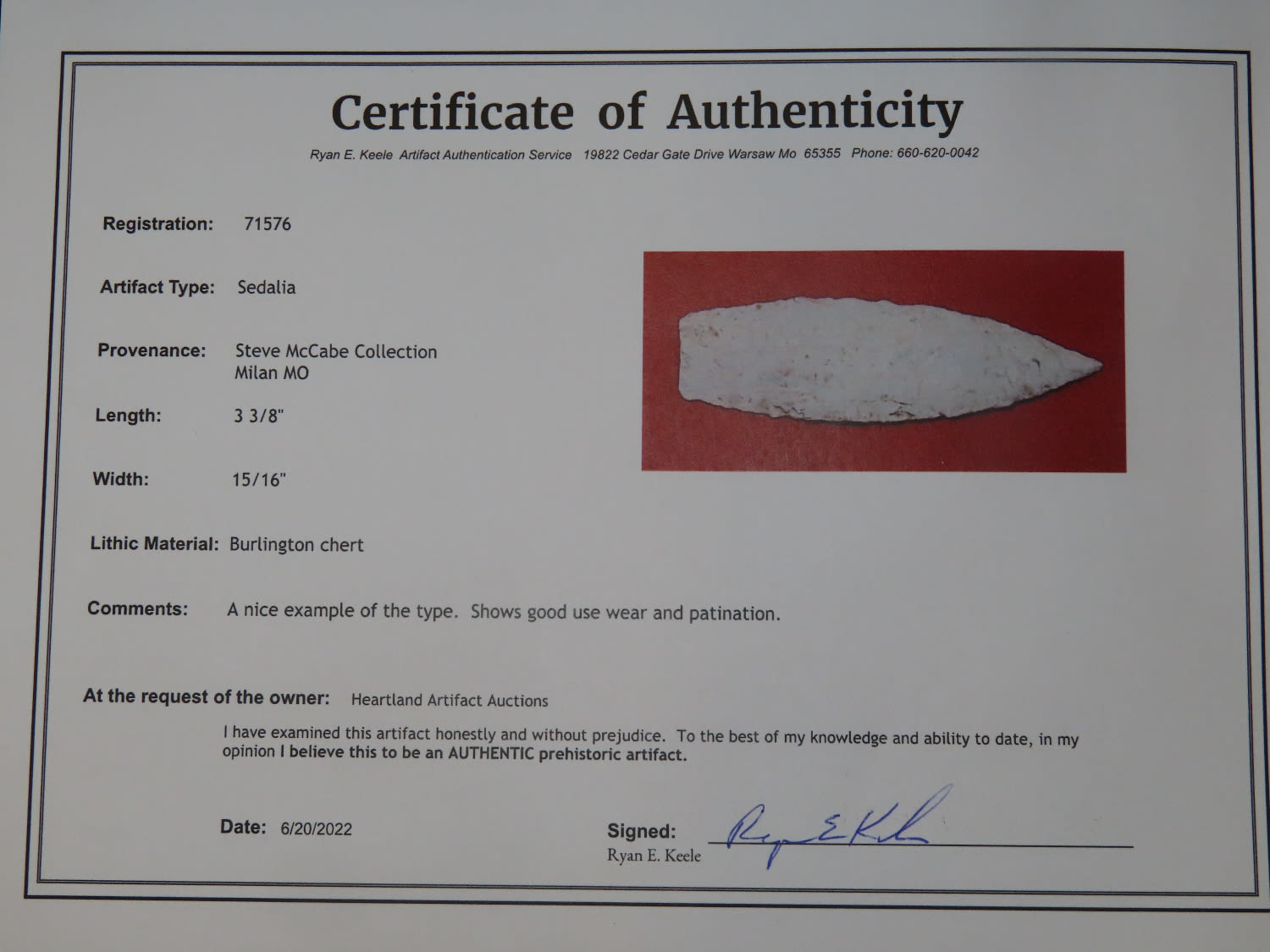 Very Fine Sadalla Keele COA 3 3/8" Steve McCabe Collection Milan Missouri
