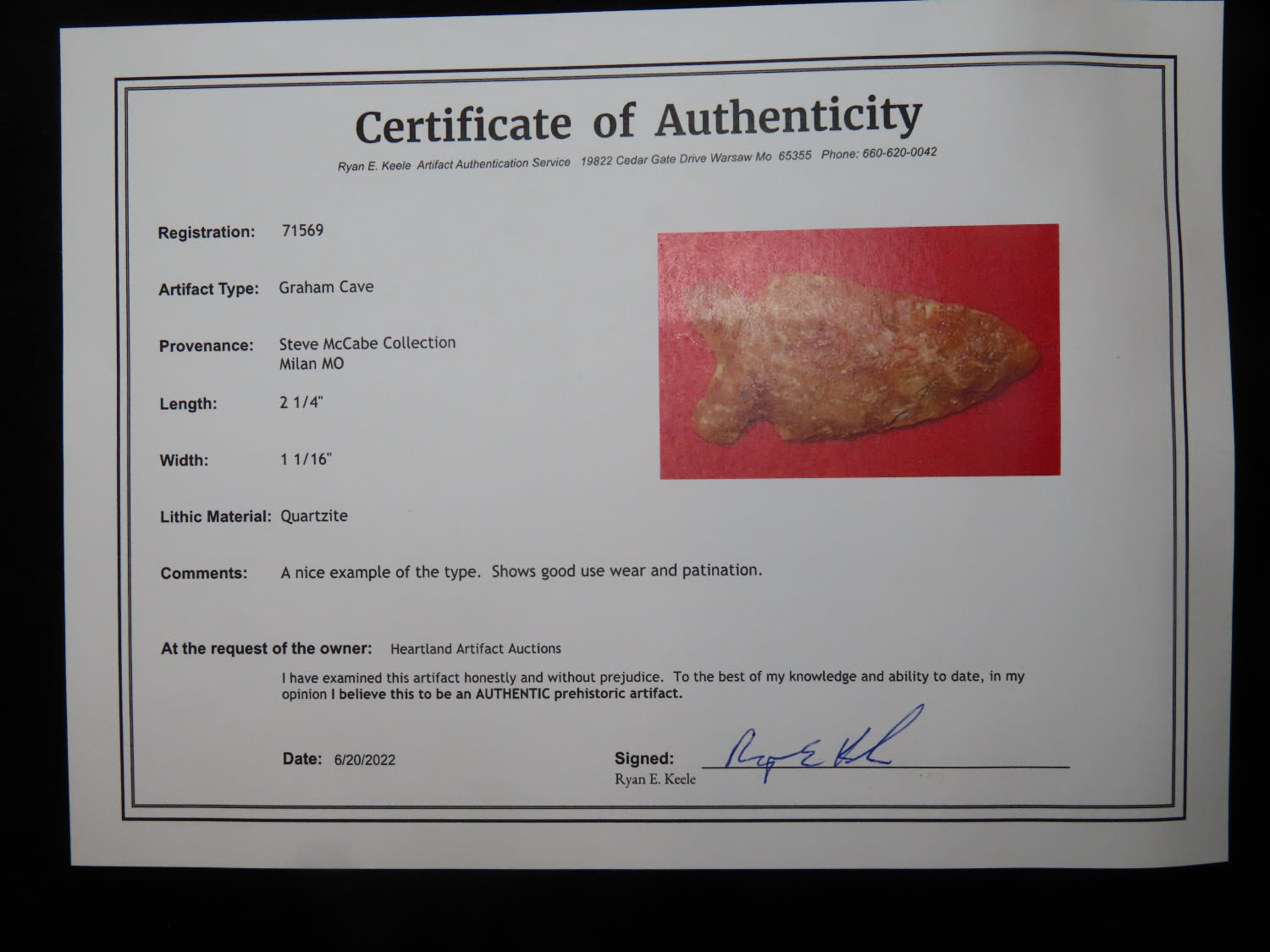 2 1/4" Graham Cave Keele COA Ex Steve McCabe found in Milan Missouri