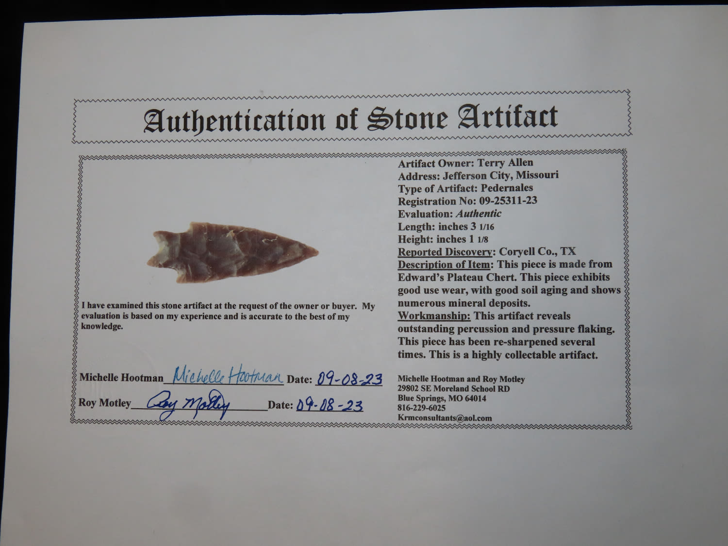 3 1/16" Pedernales Motley COA Found in Coryell Co Texas